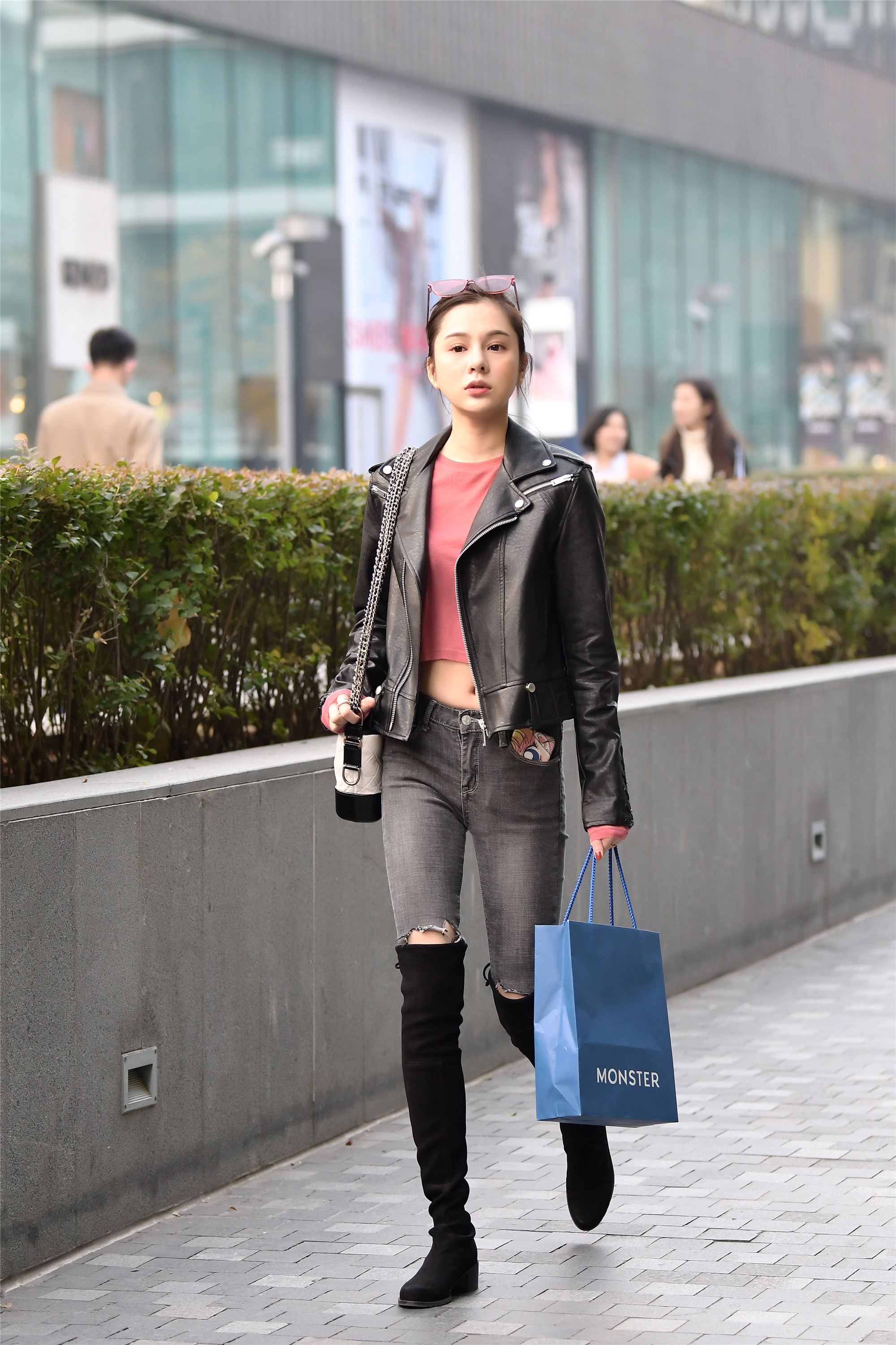 平底过膝靴搭配修身牛仔裤,是很不错的搭配,都是黑色,但是却有着不同的质感和层次,膝盖处的破洞和过膝靴的边缘相结合,感觉很不错的设计,皮夹克搭配一件桃粉色的小内搭,还有一点腰线秀出来,是不是感觉个性十足的。
