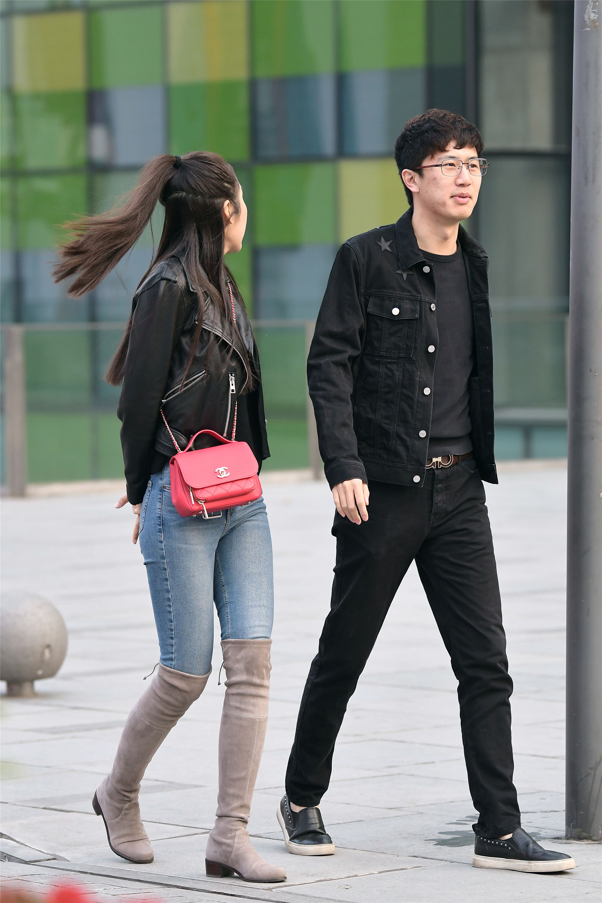 蓝色修身牛仔裤搭配黑色平底过膝靴,色彩又一些变化,也更显身材曲线,一件黑色皮夹克,虽然在秋冬皮夹克和牛仔裤是经典的组合,但是每个人都穿出自己的风格和个性,不会有相同的搭配出现,特别是在这个时尚的街区里面。
