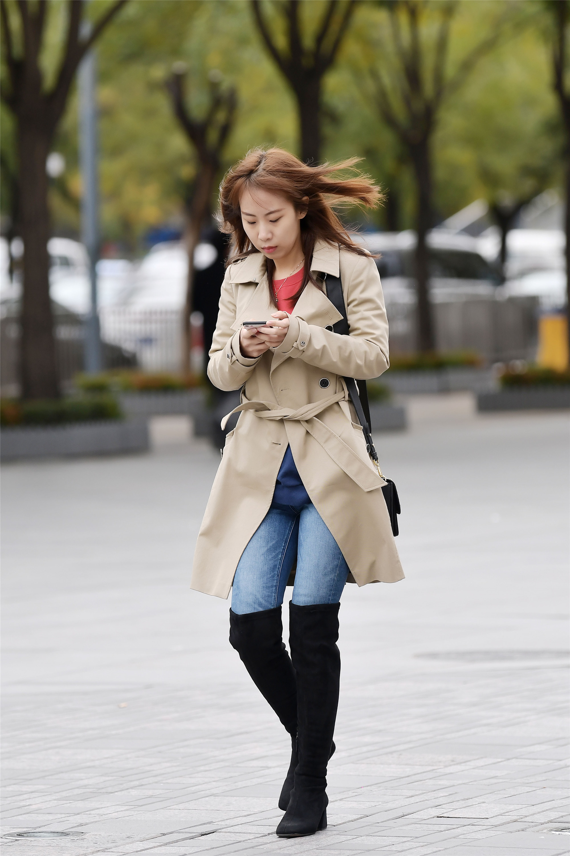 黑色平底过膝靴和蓝色渐变牛仔裤,这样搭配非常个性,一件米色风衣,腰带简单的系一下,随意而自然,却也显出腰线,也展示身材比例效果,微风轻轻吹起秀发,让你感受到秋风味道。