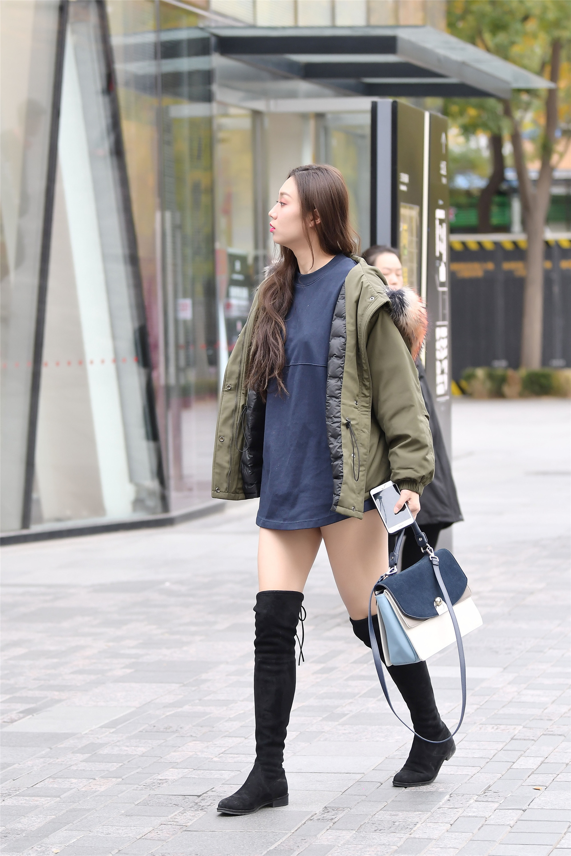 黑色绒面过膝靴,搭配一件大半袖,姑娘不瘦,因为高挑,身材还非常匀称,而且腿型很直,所以这样搭配过膝靴也很漂亮,绿色棉服穿在身上,一点也没有臃肿的感觉,就这样敞怀穿着,这就是属于她的穿衣个性和风格。