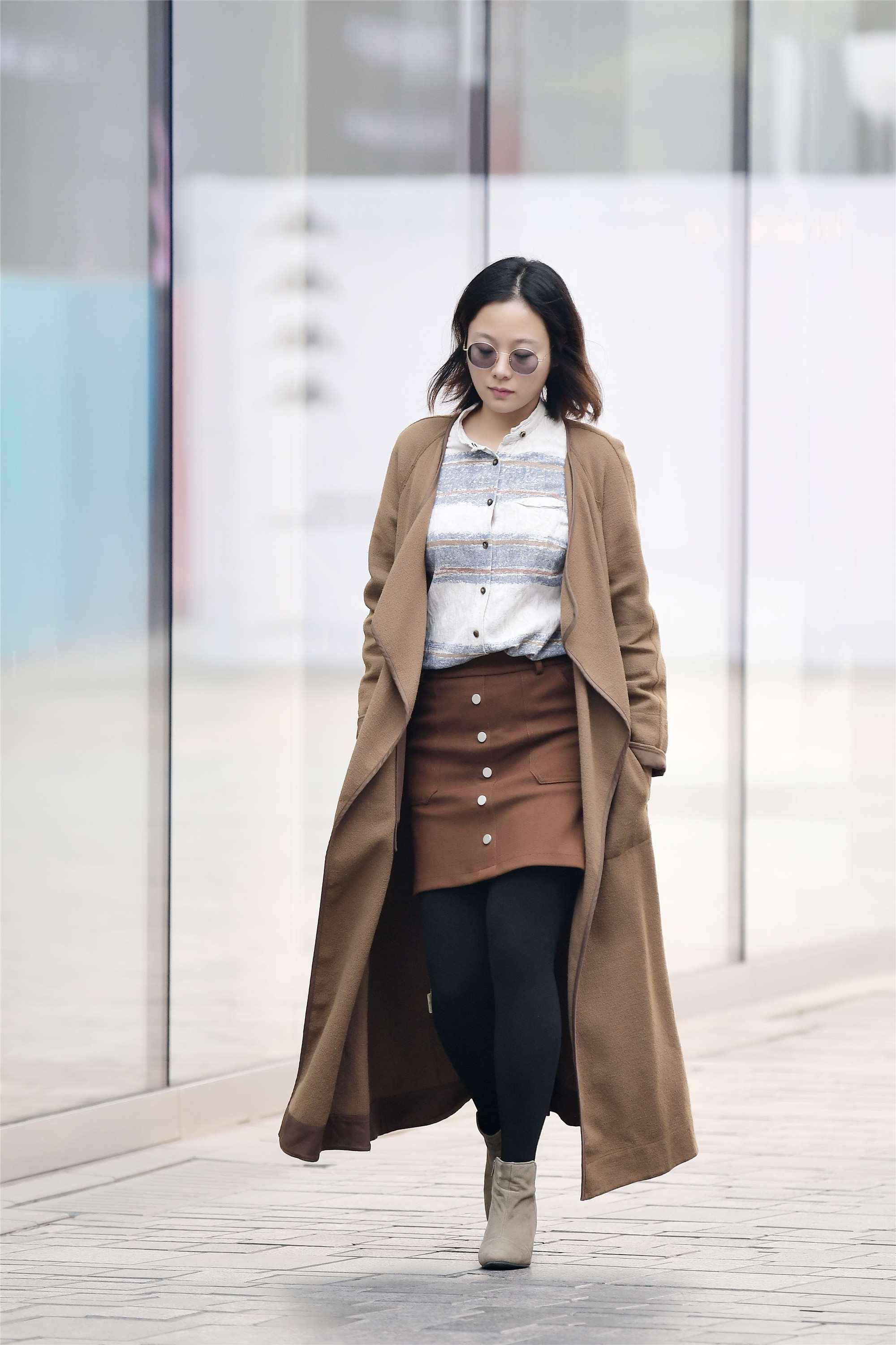 风衣是秋冬季节很好的搭配服装,让你有着风度翩翩的感觉,又会比较保暖,而且内搭也可以用不同的色彩来衬托一下,白色条纹衬衣搭配棕色的筒裙,厚实的黑色打底裤更起到保暖作用,在搭配一双短靴,时尚、风度和保暖同时具备了。