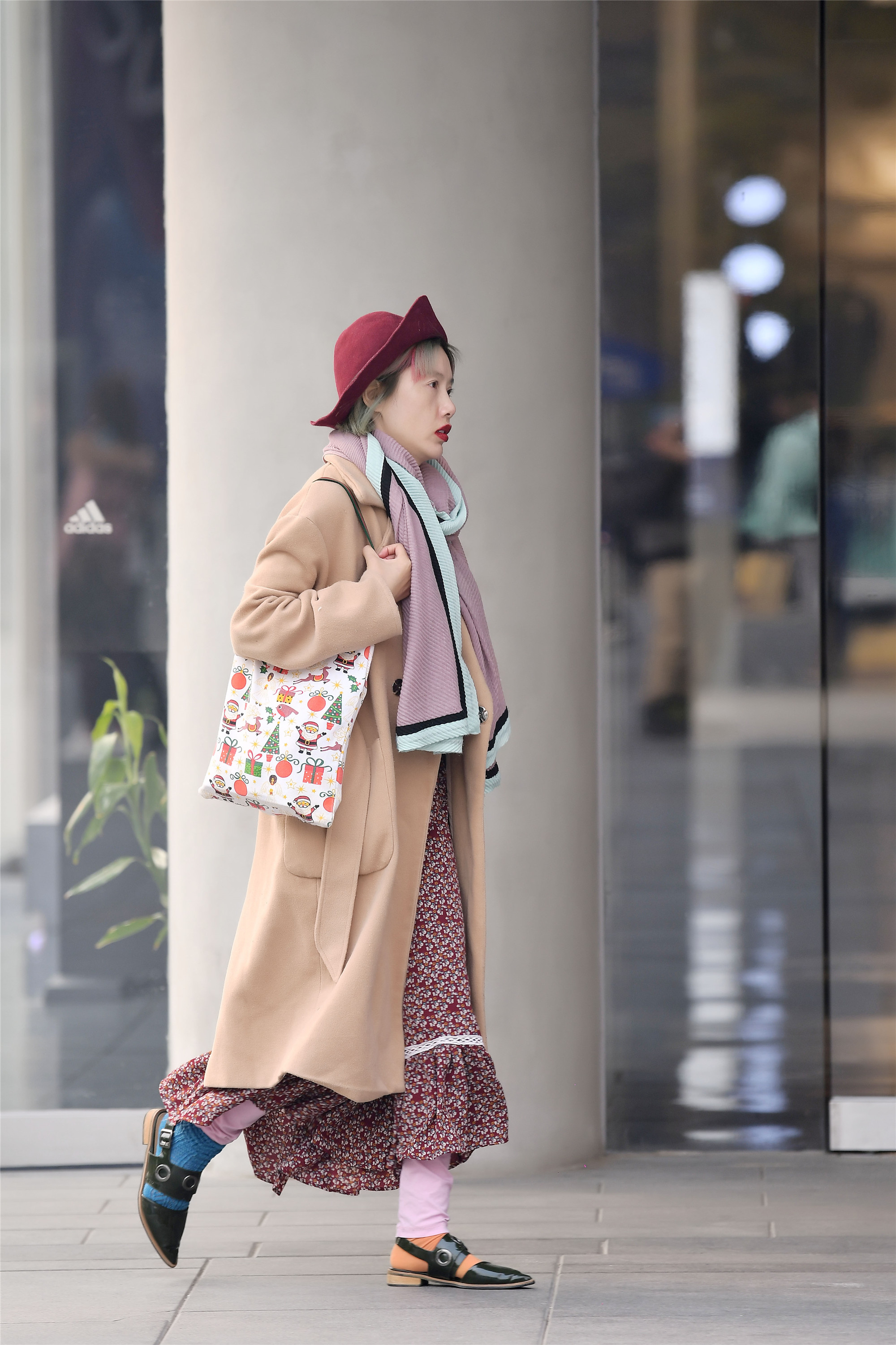 也会有人很喜欢彩色,秋冬时节树叶开始凋零,似乎到了一片灰色的时节,时尚街区的美女,却从搭配上,给你更多的色彩,红色帽子,粉色和蓝色相交的围巾,米色风衣和红白的斑点长裙,就连她的袜子都是不同颜色的,这样一身有色彩的衣服,虽然不是谁都能驾驭得了的,但是喜欢色彩的姑娘,可以尝试一下。