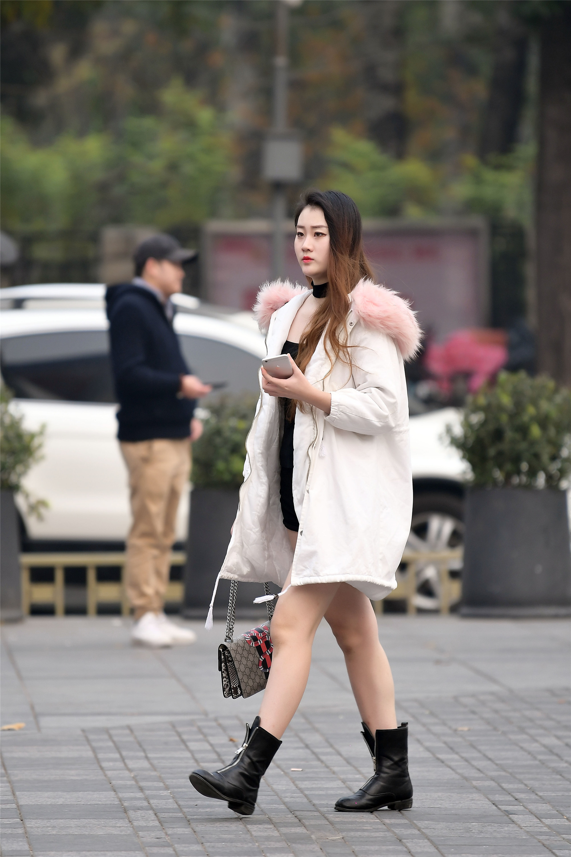 白色的棉服,帽子上的粉红色皮草装饰,更显得暖色和小女生的感觉,一件黑色连衣短裙,与白色棉服相衬托,一双经典的中间拉链的短靴,搭配出秋冬的感觉来。