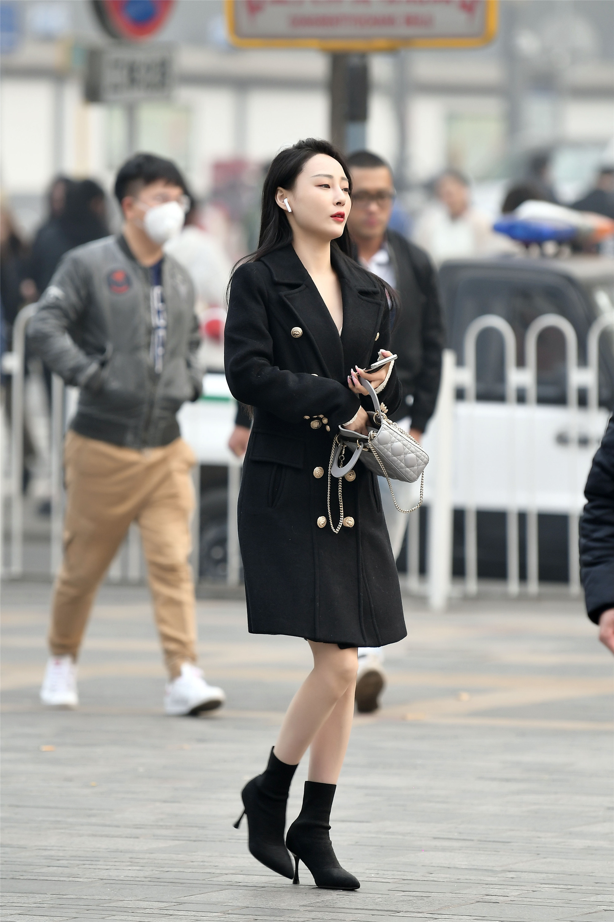 中长款黑色搭配,上面点缀着双排的金色扣子,更显的高贵大气,搭配一双尖头细跟短靴,非常简单的穿着,却看着非常漂亮,当然这也是那些不怕冷的姑娘这样着装才好看,淡妆出行,会让你更显精致一些。
