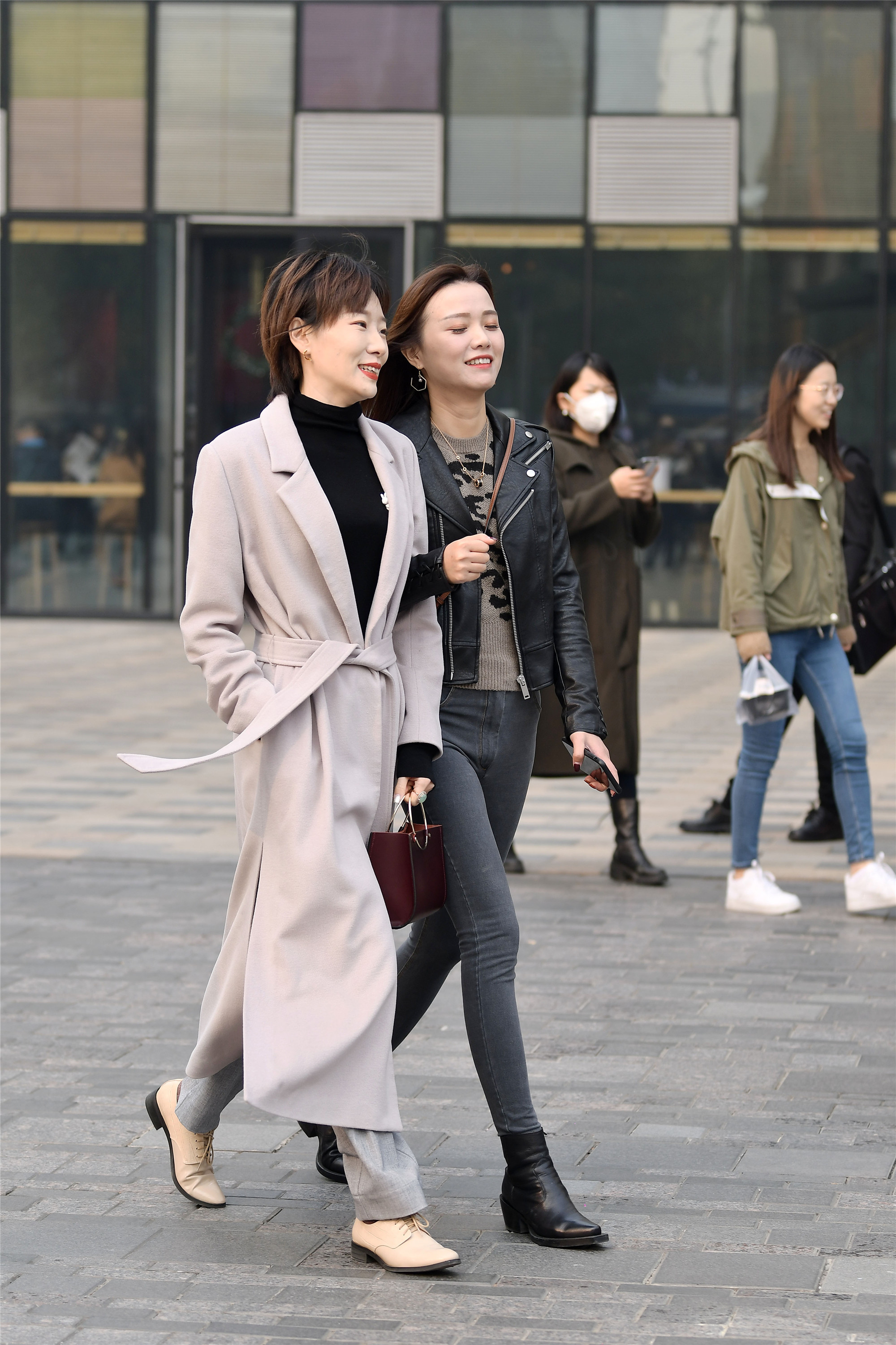 也许风衣这样穿更有美感,直接把腰带系上,不要把风衣裹在身上,而是前衣襟要秀出自己的黑色内搭来,很显瘦的感觉,她的闺蜜黑色牛仔裤搭配黑色皮夹克,这是属于她们的秋天搭配,简单却很好看。