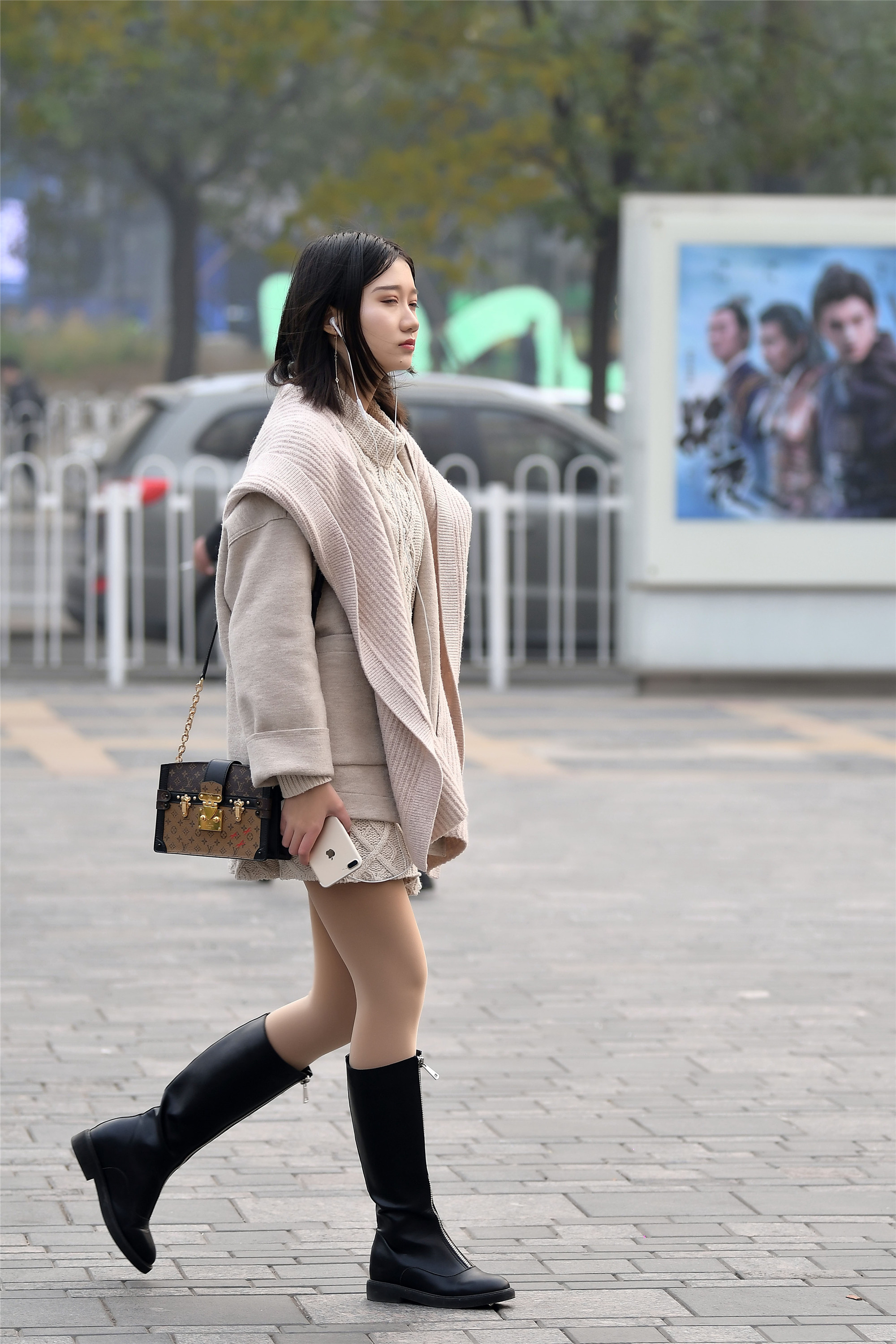 这一件针织与外套相结合的衣服,非常有个性,暖色调,中长款式,让你显得非常可爱,一条光腿神器的打底裤搭配一双黑色高筒靴,内增高的款式更显得个性十足,带着小女生搭配的感觉。