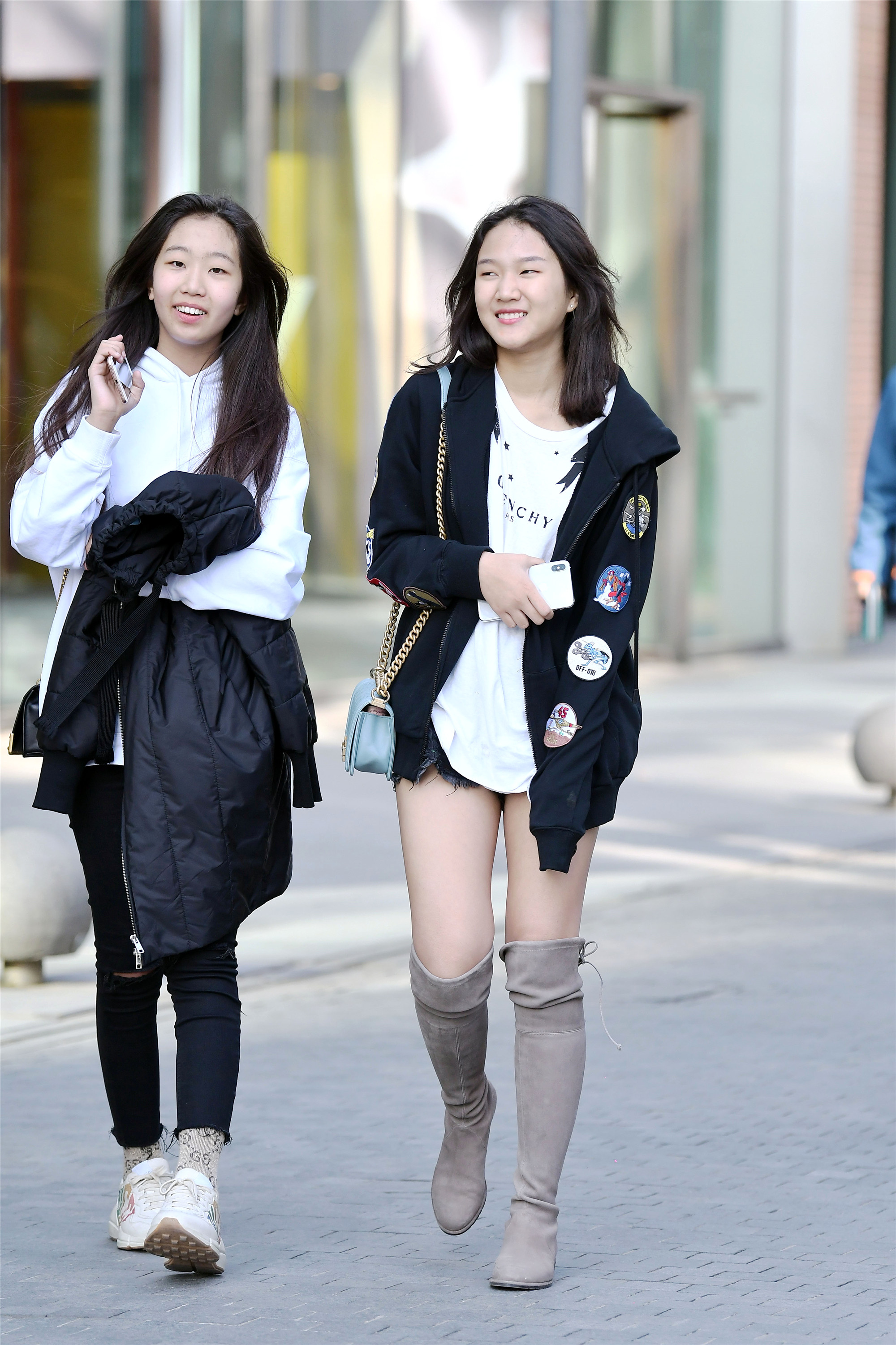 这一对小姐妹,她们有着相似的年龄段,也有着相似的审美搭配,都是那种带着跳跃思维的姑娘,所以她们开心的走在一起,休闲和嘻哈感觉的搭配,也非常符合她们这个略微带着一点叛逆的年纪。