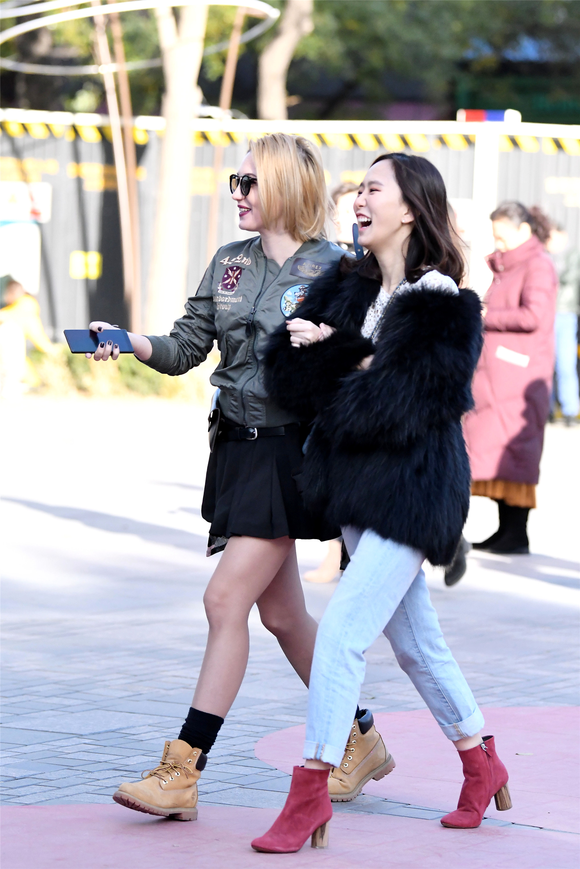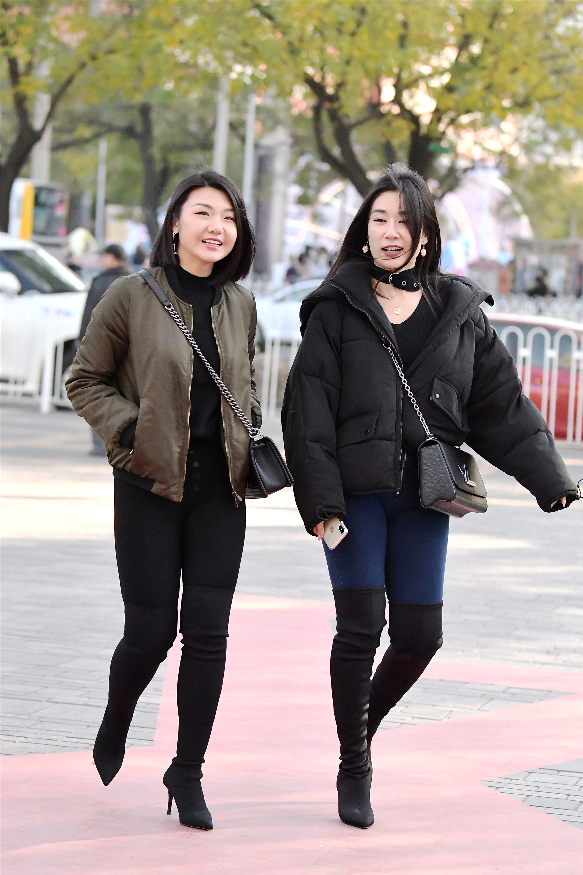 这一对闺蜜她们是喜欢修身搭配的,修身牛仔裤搭配尖头细高跟过膝靴,她们将自己搭配非常精彩,而且采用棉服和夹克,会有那种松弛有度的感觉。