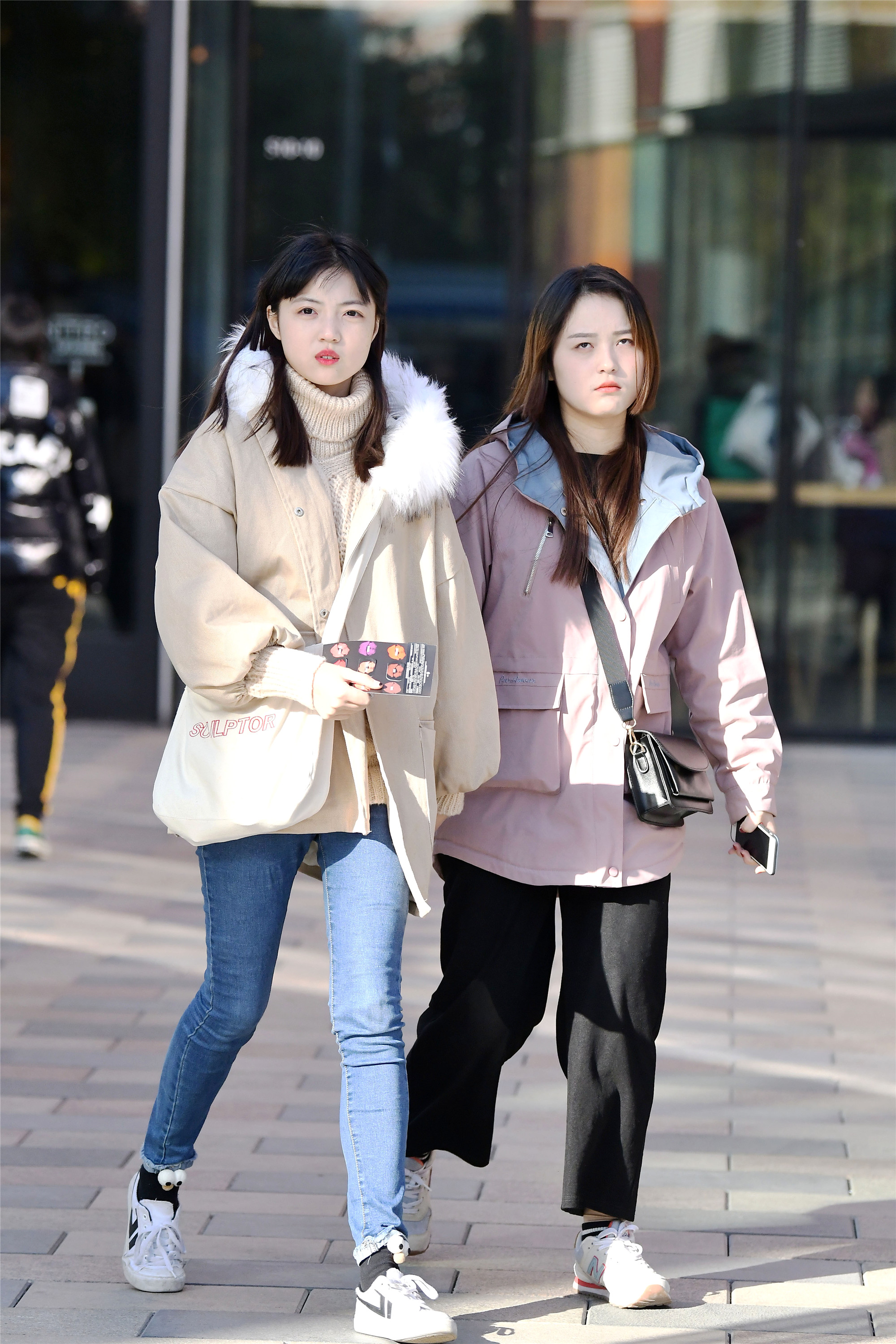 她们带着可爱的面孔,说童颜一点也不过,保暖和休闲的搭配风格,她们穿着一件棉服,长裤和运动鞋,好闺蜜就是走着风格相似的路线。