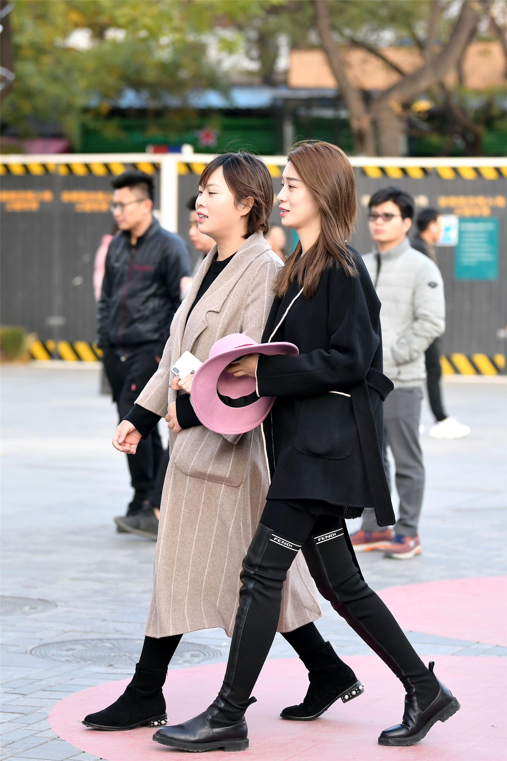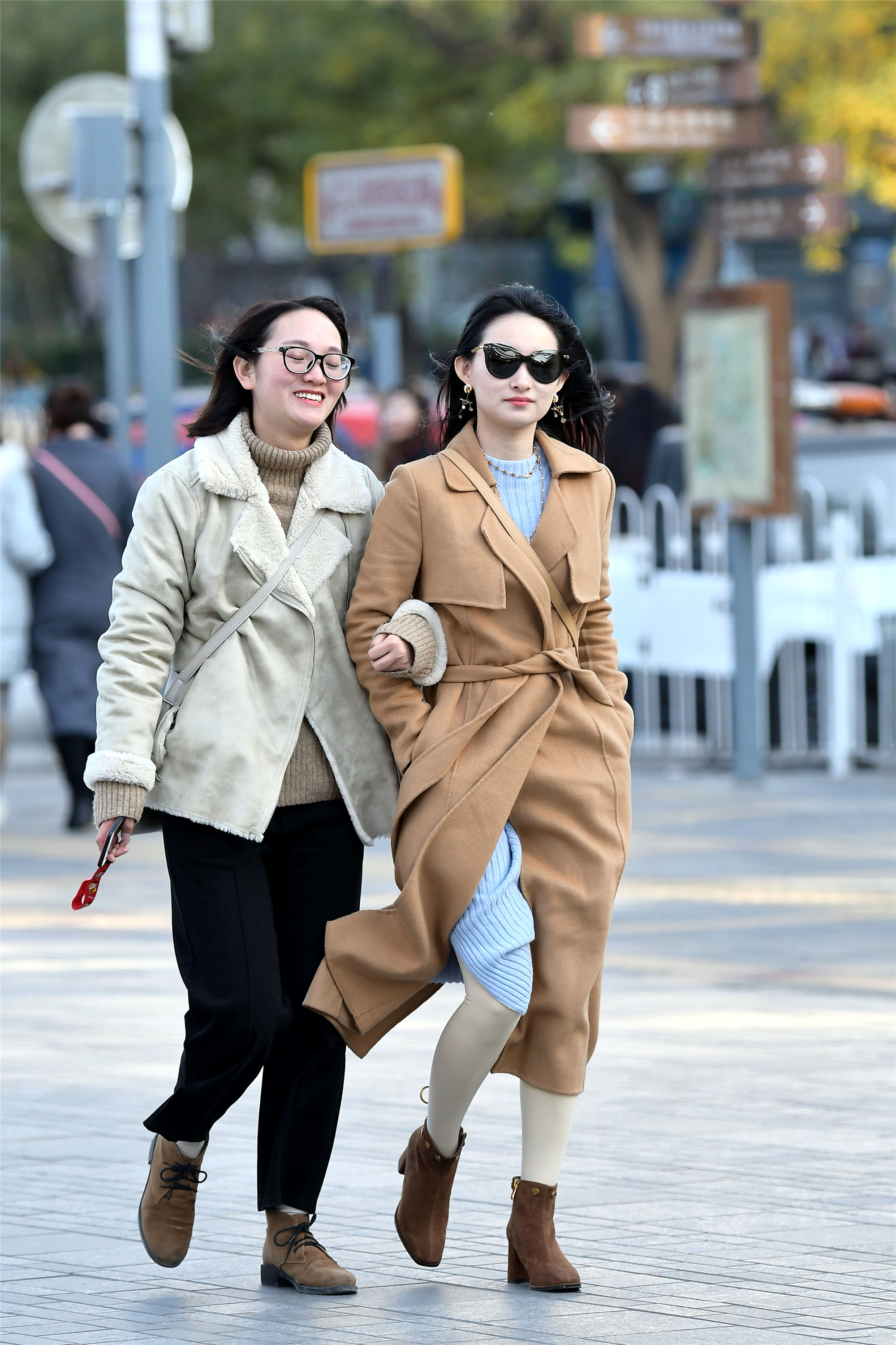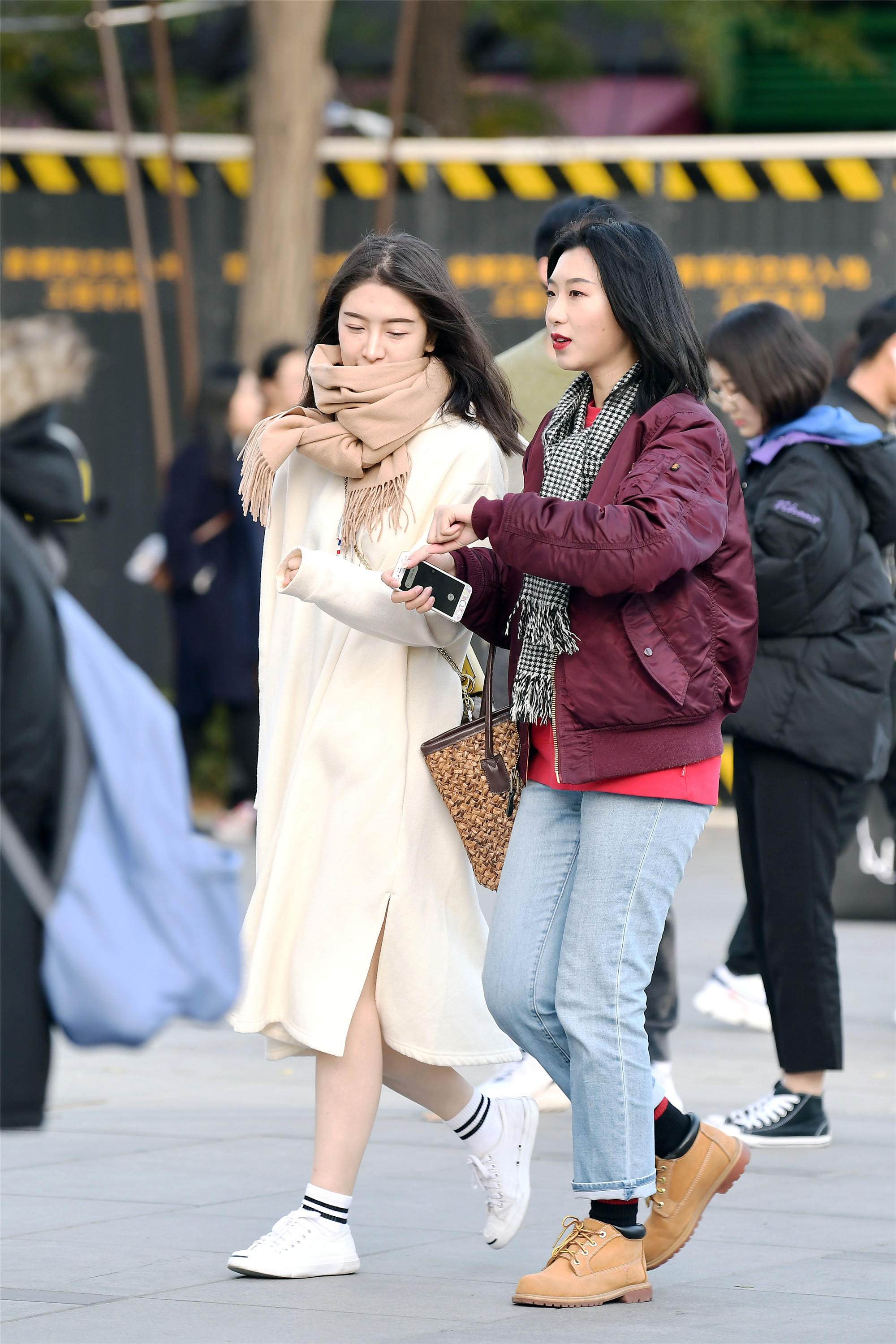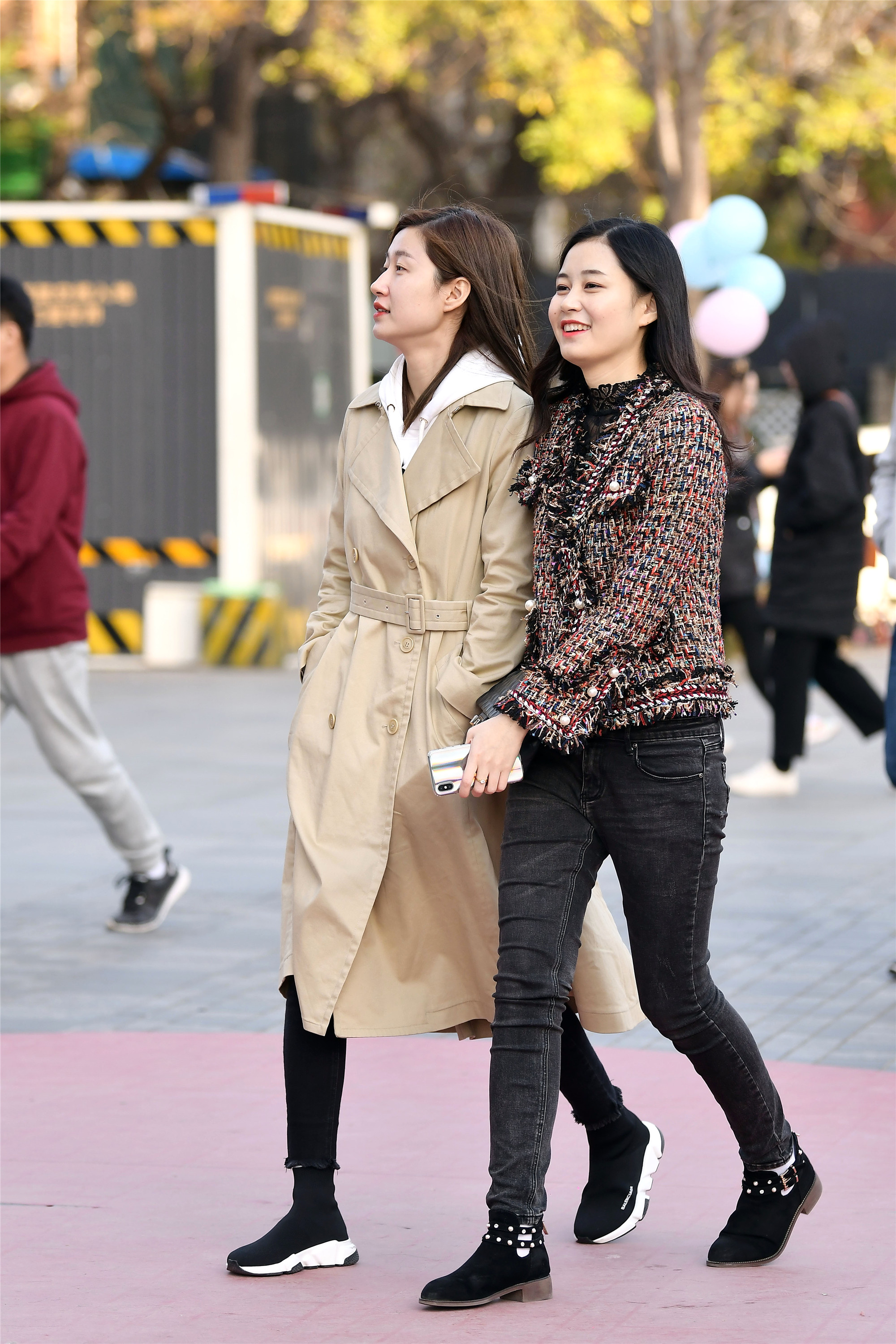 互相欣赏,才能够坚持你们之间最好的关系,这一对闺蜜她们都非常会选择衣服,米白色长款风衣,黑色修身裤和运动袜靴,对比效果很不错,而她闺蜜是粗呢编制上衣,搭配牛仔裤和一双黑色小短靴。