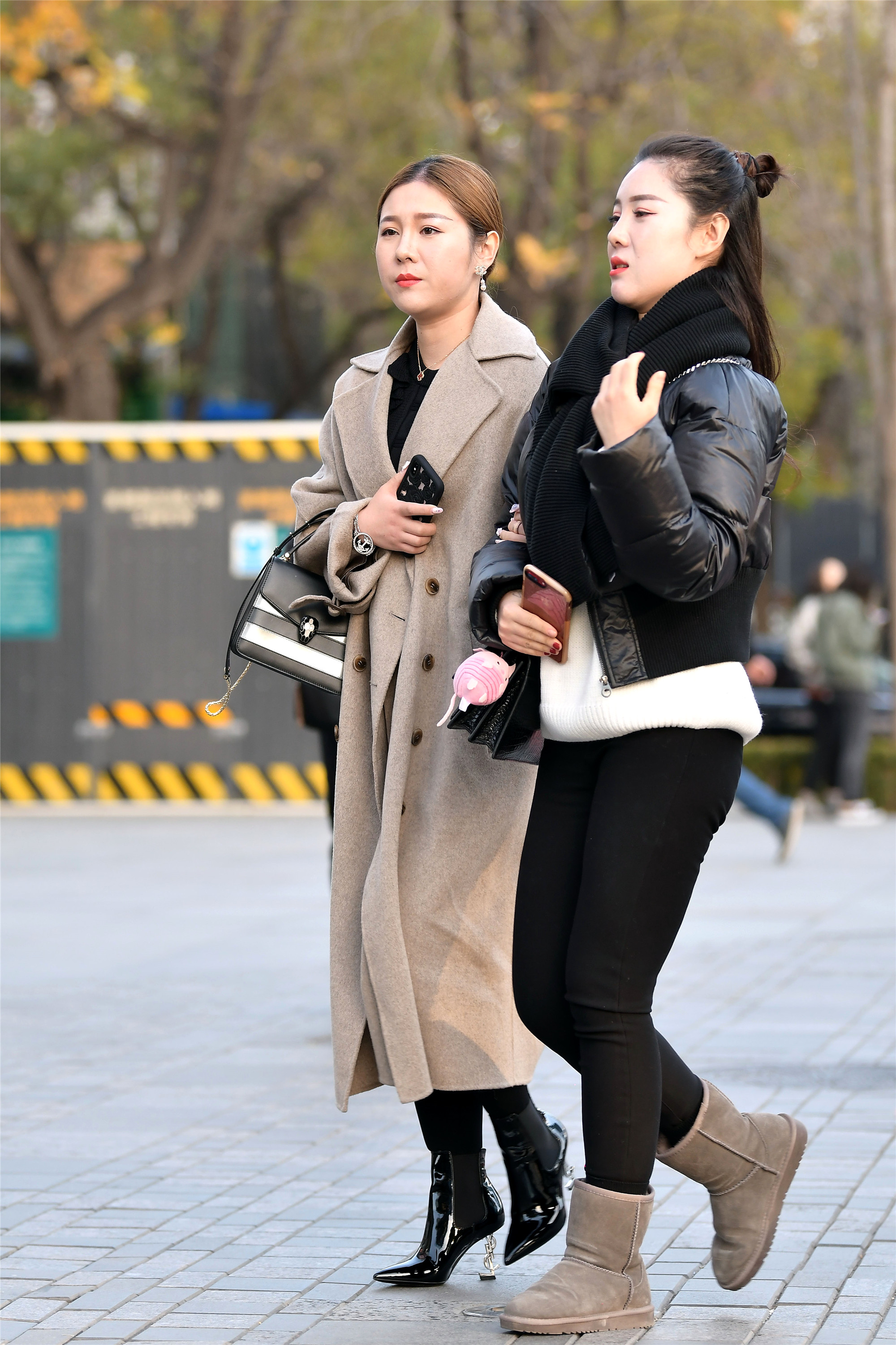 灰色长款风衣的姐姐,她一双漆皮的尖头高跟鞋,鞋跟的个性设计,显得很贵气,价值不菲,而她的闺蜜却搭配的很有层次,也很保暖,黑色羽绒服内衬白色毛衣,黑色裤子搭配灰色雪地鞋,她们之间的风格不一样,但是却互相映衬彼此。