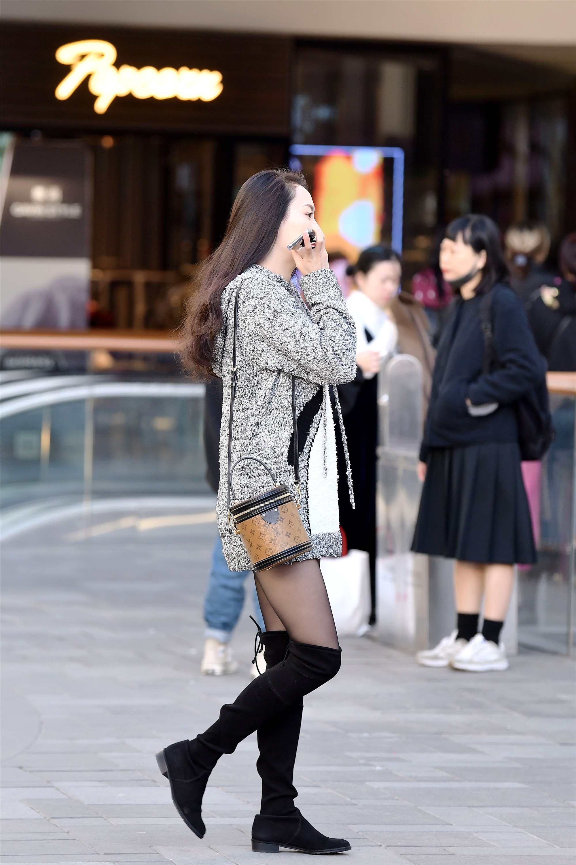 高筒靴与黑丝袜搭配,是很经典的组合,秋天这么搭配显得很有气质,带着一点保暖的效果,有起到了修身的作用,粗呢针织外套,毛边的设计会有着一点流苏的感觉,粗呢纹理也显得非常高级。
