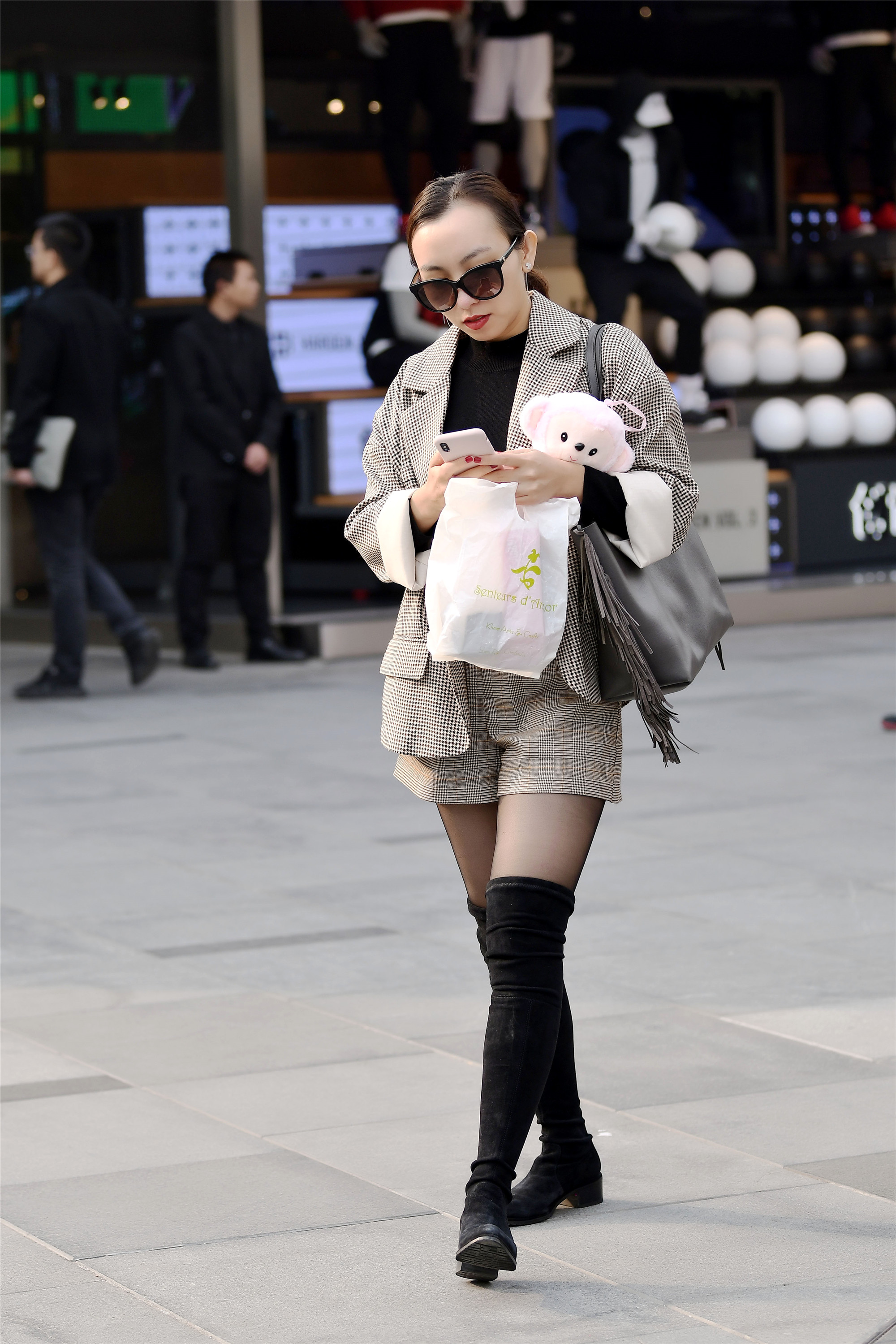 最近几年流行西短裤,就是和西服搭配在一起的短裤,相同材质或者相近的纹理,而且很多时尚姑娘搭配出来的效果都很不错,而且也可以随意的搭配自己喜欢的长靴类型,这位姑娘格子西装和格子短裤,搭配着黑丝袜和绒面过膝靴,显得那样干练又个性十足。