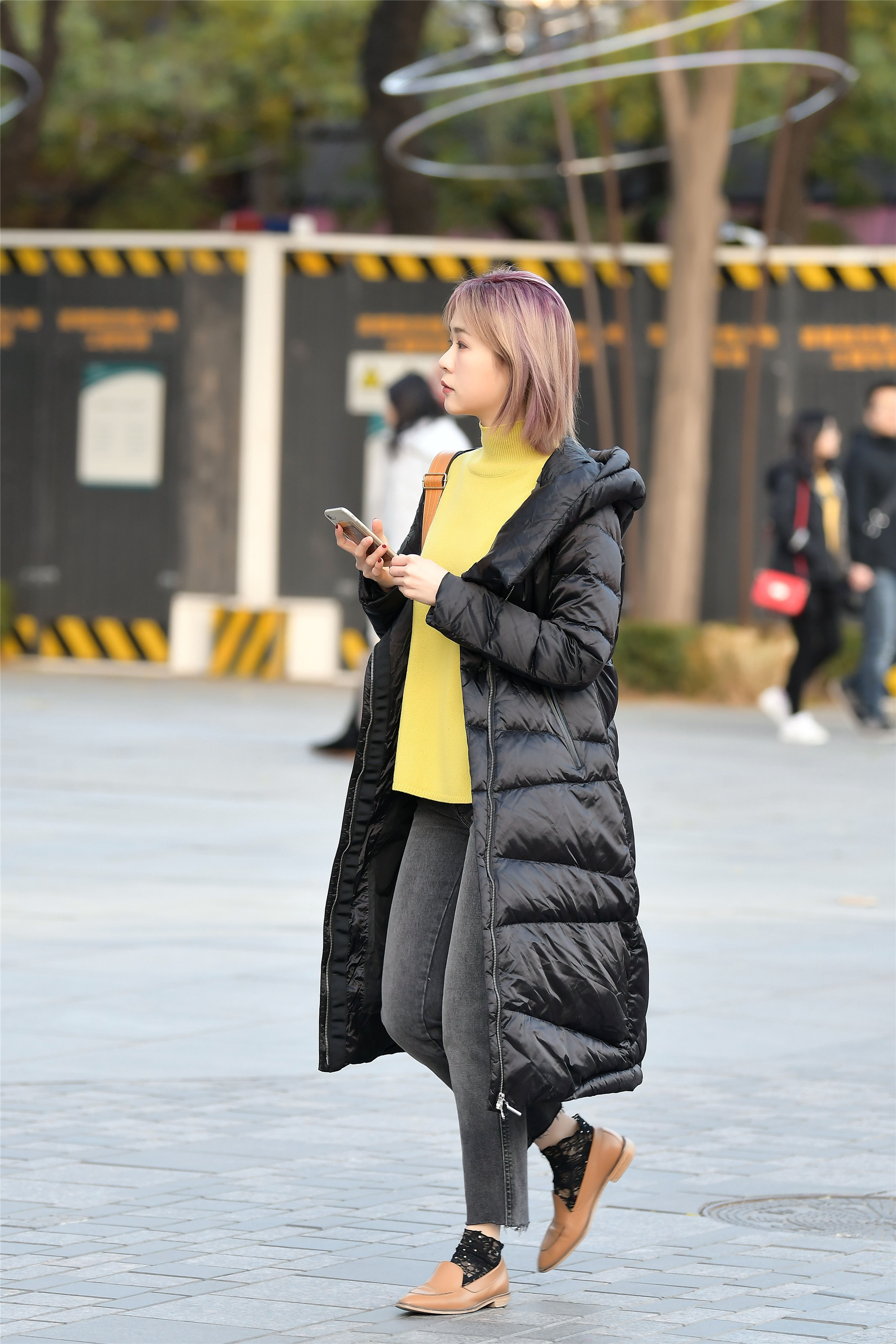 黑色羽绒服在深秋时节搭配出来,可以敞怀出门,秀出自己的内搭来,黄色针织衫搭配一条深灰色牛仔裤,虽然穿着一双棕色平底鞋,却搭配黑色蕾丝短袜,时尚个性的穿搭。
