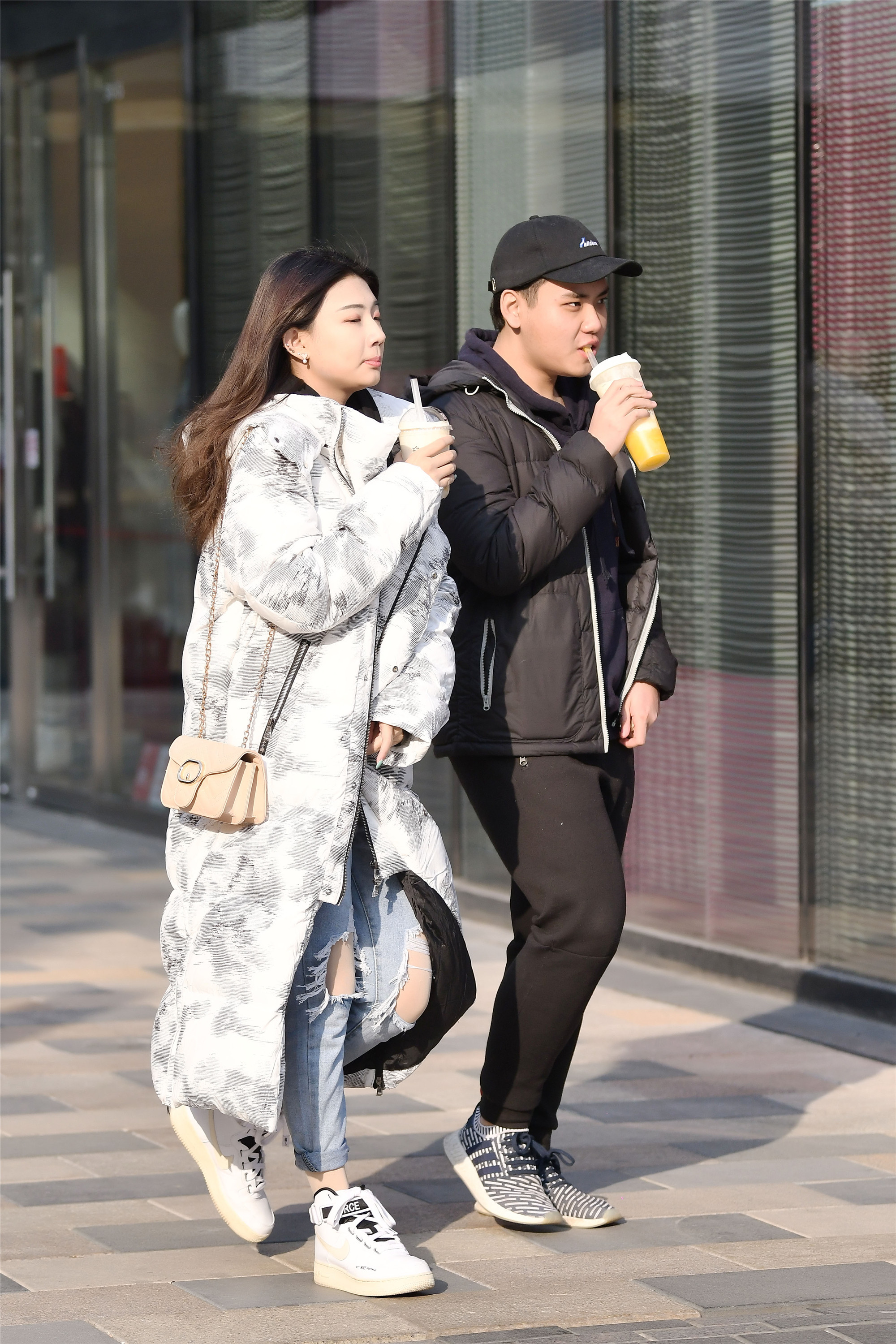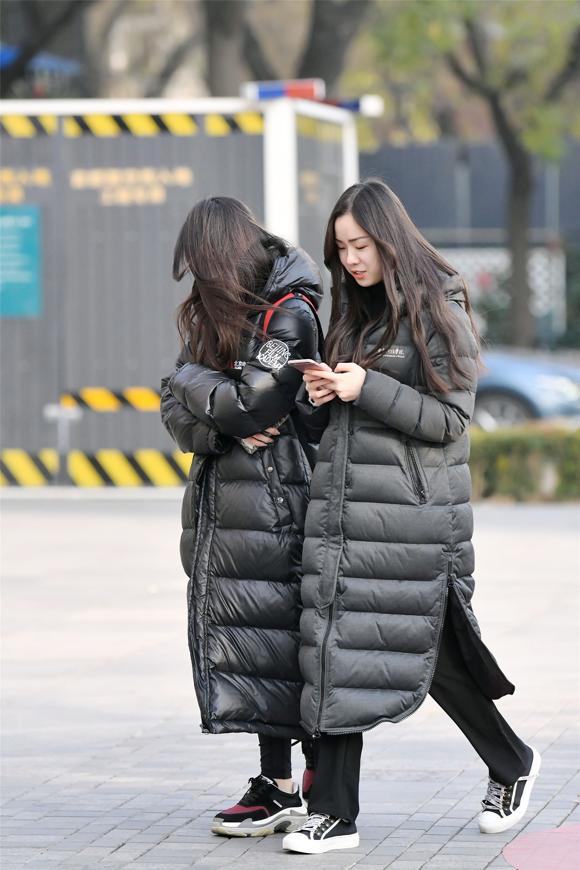 这是一对闺蜜姐妹,她们是一身黑色长款的羽绒服,里面是黑色长裤搭配着平板鞋和运动鞋,显得休闲时尚,宽松的搭配有显得有些小女生的个性。