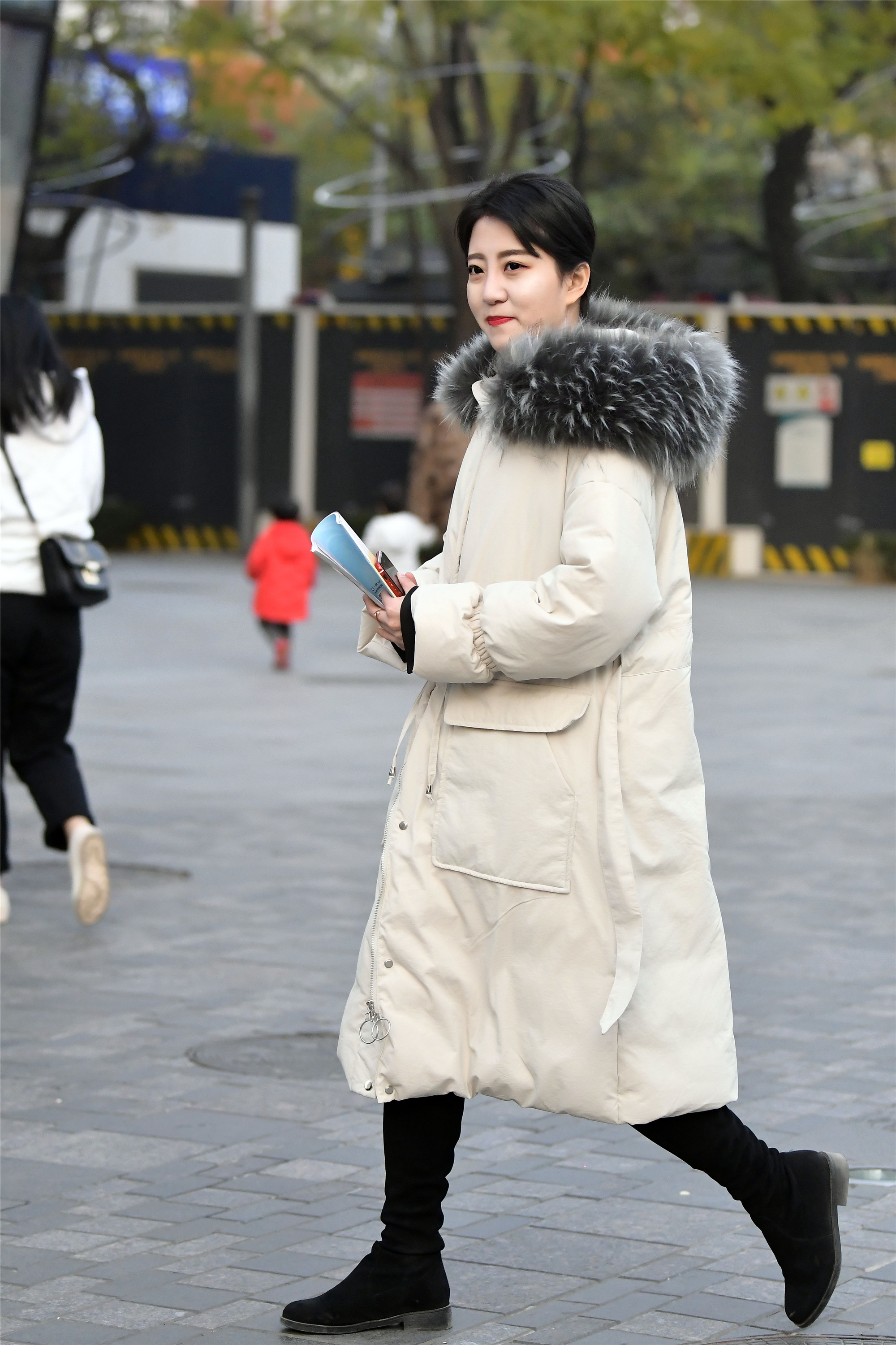 米白色的长版羽绒服,羽绒服帽子边采用毛绒绒的皮草作为装饰,更显小女生的感觉,搭配一双绒面高筒靴,即使到了冬天,这样的搭配也是很保暖的,而且还显得人很精神。