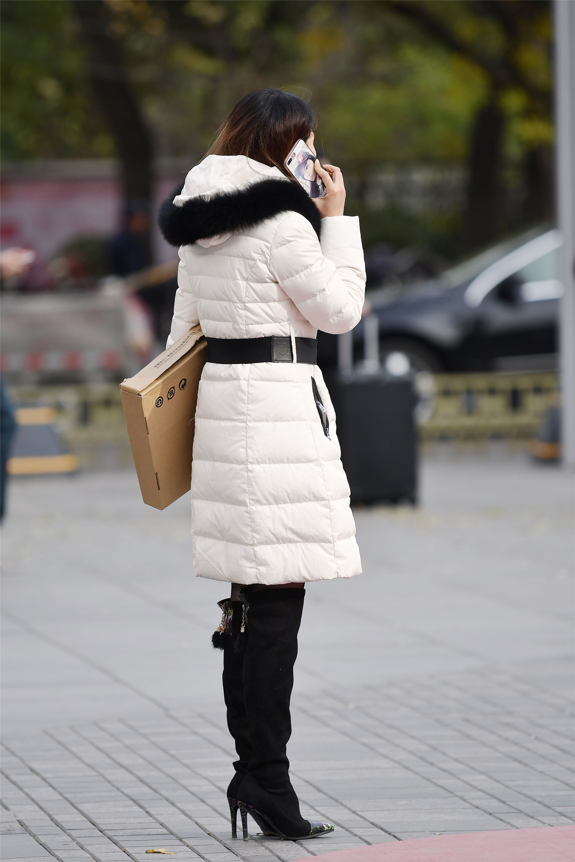 白色中长款羽绒服,中间一条黑色腰带,让你看到她的身材比例特别的好,一双尖头细跟过膝靴,更是衬托出她的身材来,这样大气又漂亮的装扮,让你显得成熟稳重。
