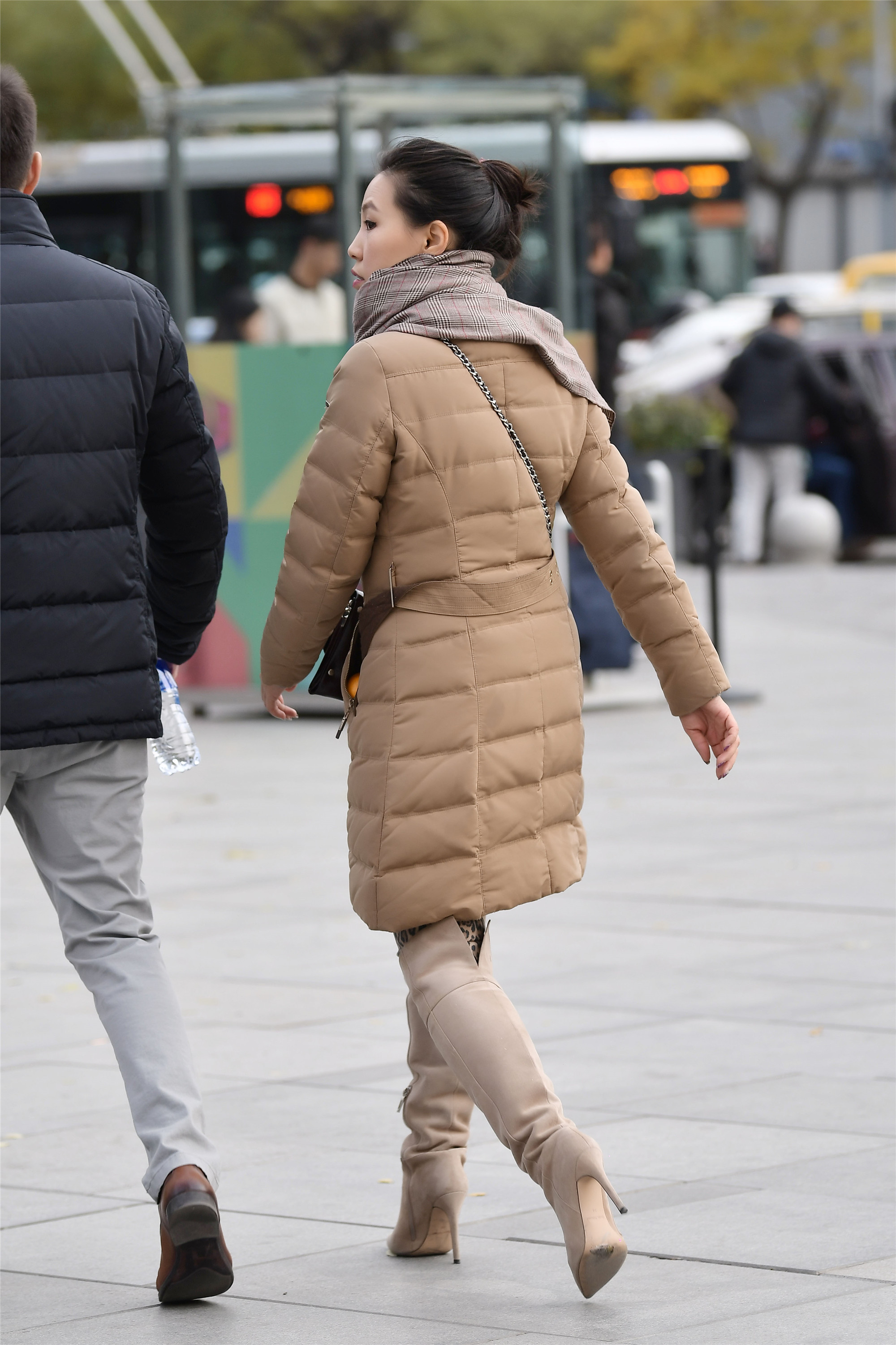 灰棕色羽绒服,搭配着一双米灰色尖头细高跟过膝靴,虽然她的身材不是非常高挑,她将自己的发式盘起来,更显精神干练,这样一身搭配也非常时尚漂亮。
