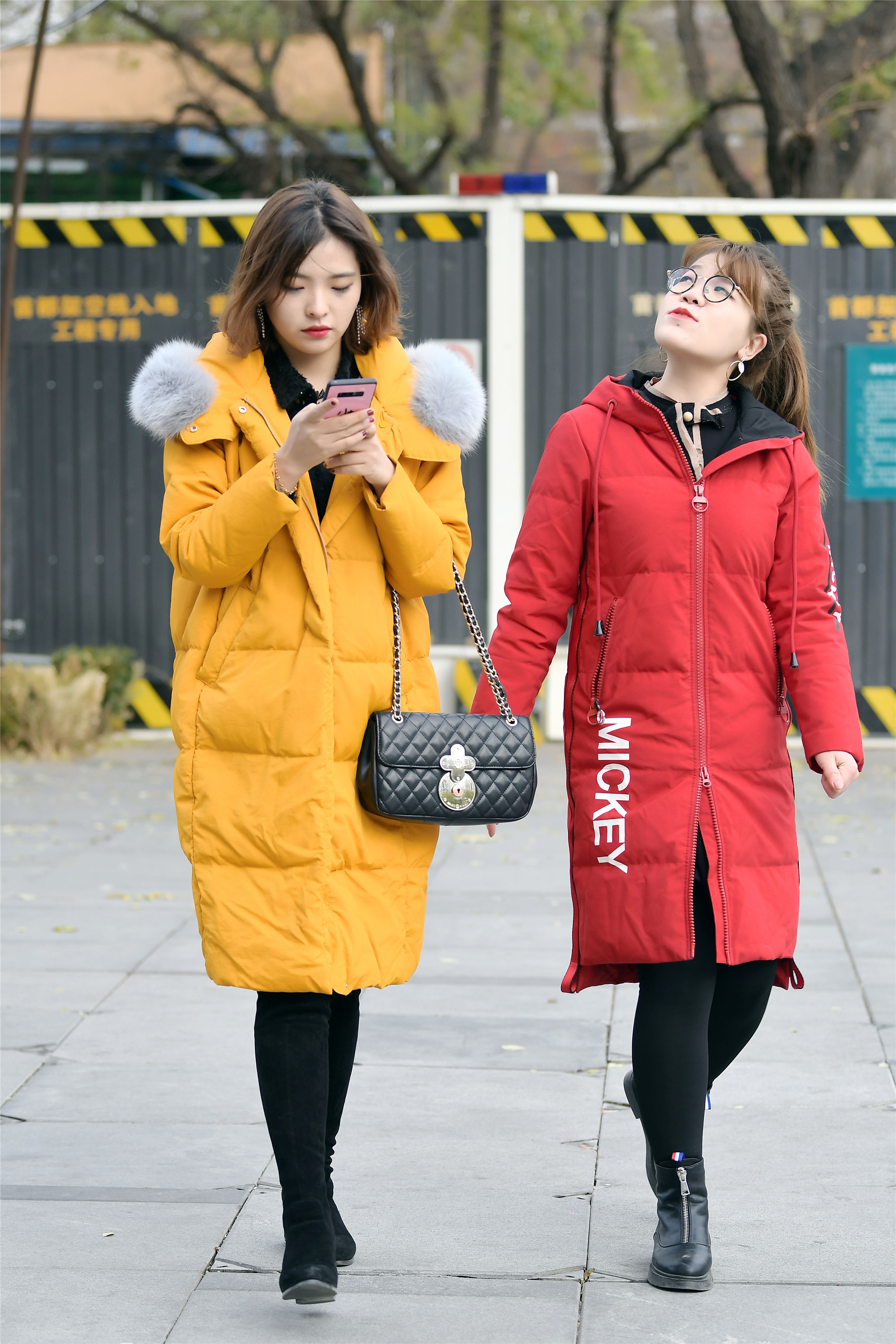 一对闺蜜,她们穿着长款的羽绒服,红色和黄色,是不是她们出门之前都商量好了,穿这么鲜艳色彩的羽绒服,而且这么搭配的姑娘真的不多见,大部分都是黑色或者灰色羽绒服居多。