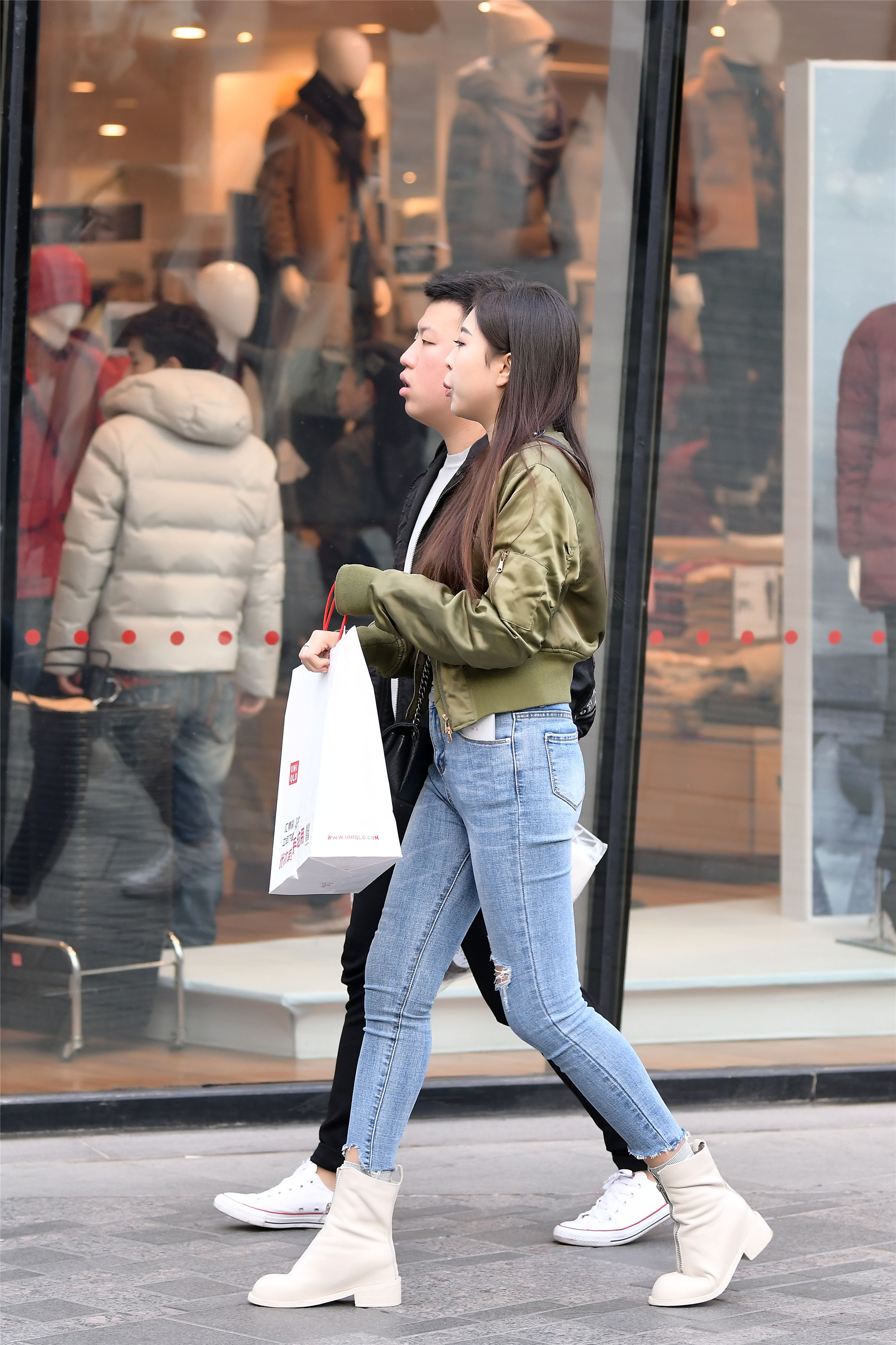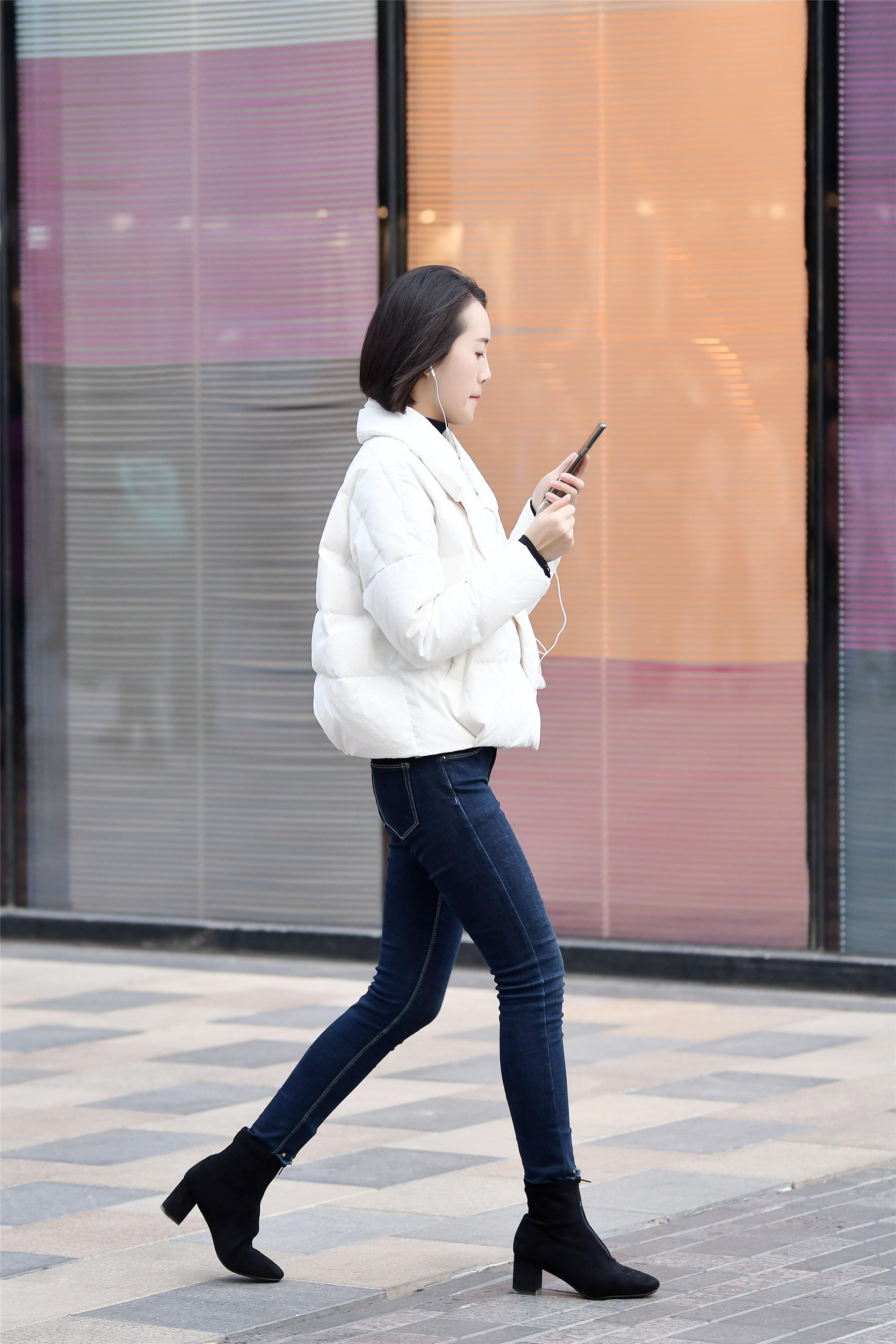 用对比强力的色彩,也是秋冬季节比较常见的,白色小羽绒服搭配深蓝色牛仔裤,一双黑色短靴,姑娘身材高挑纤瘦,在这样搭配下,更显的个性十足了。