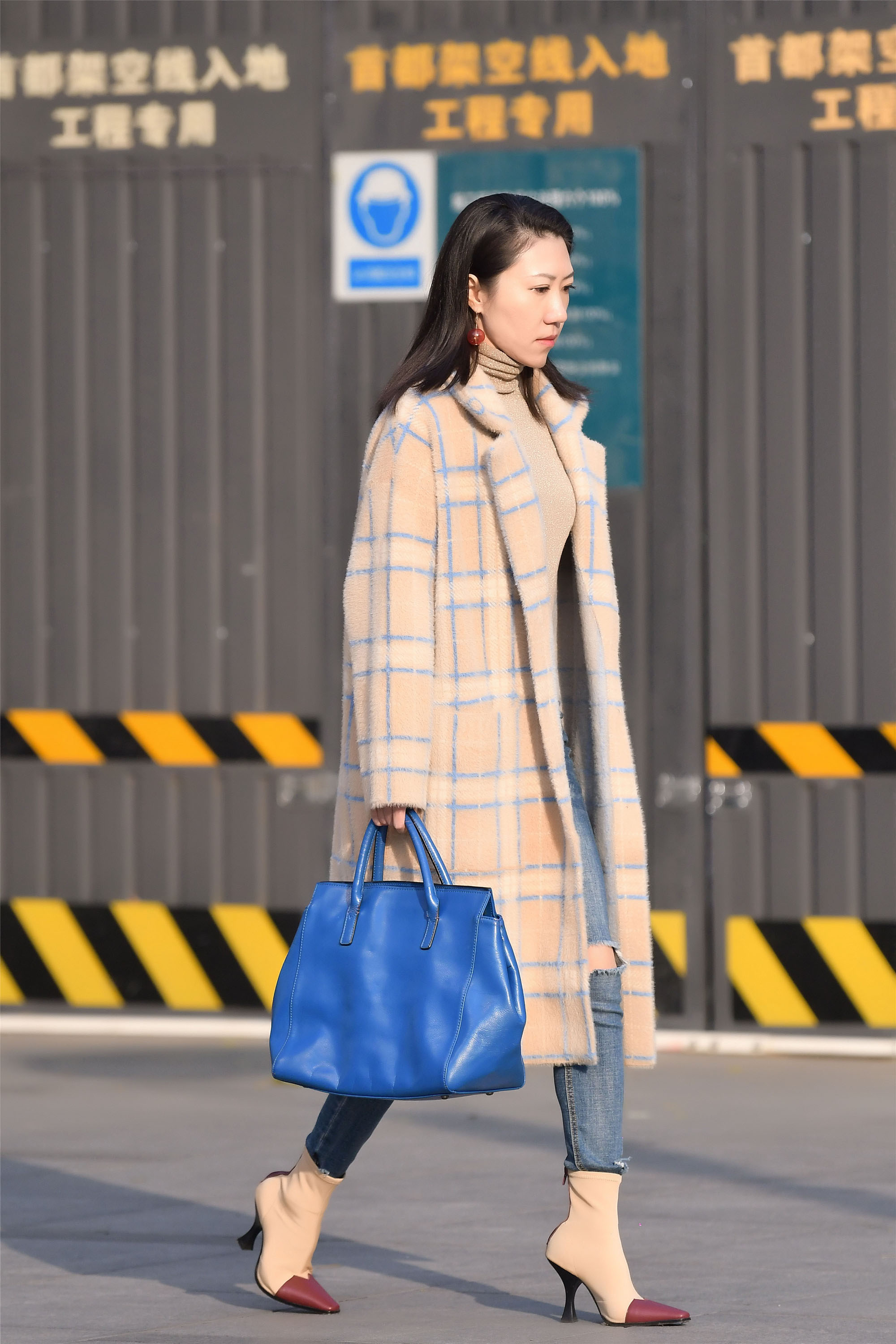 修身牛仔裤搭配一双带一点跟的短靴,又会给你不一样的感觉,拼接色的短靴,和她米黄色格子大衣色彩又呼应,暖色调的搭配也会让你觉得秋天也很不错。