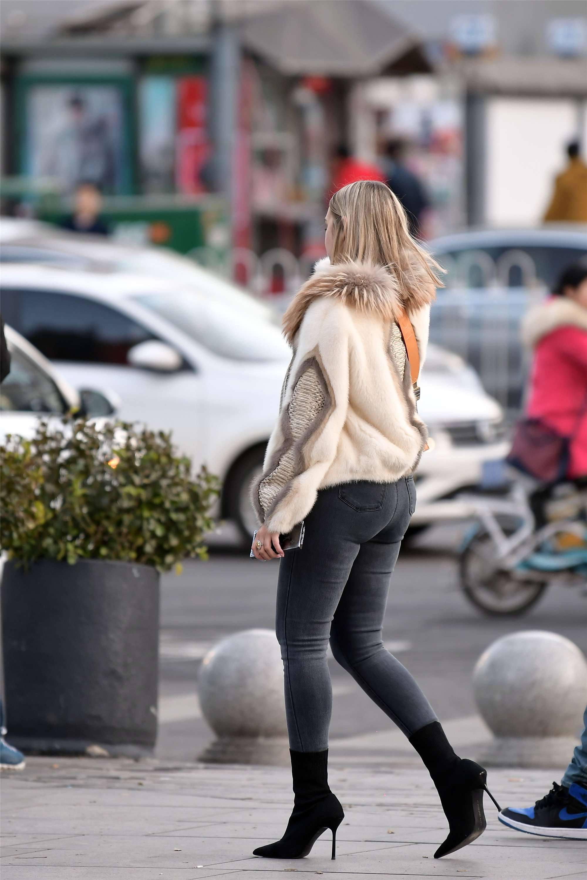 黑色修身牛仔裤搭配一双黑色绒面尖头细跟短靴,略显丰腴的身材,却展现出了无限的时尚成熟魅力,暖色的皮草上衣,更突出高贵大气的时尚感觉。