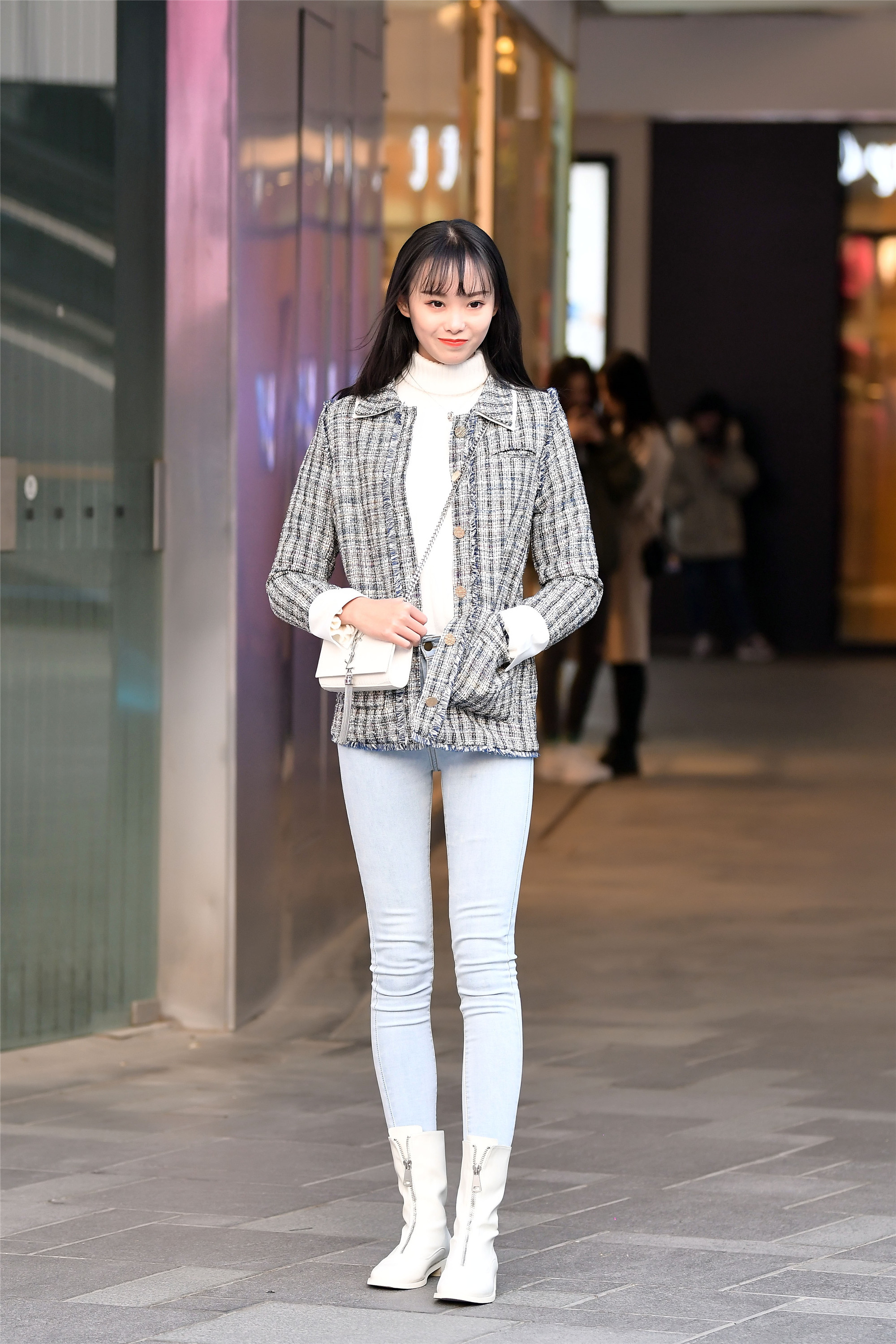 天蓝色修身牛仔裤,搭配一双白色小短靴,姑娘身材高挑,而且本身的比例也很好,就拥有一双大长腿,而且身材纤细,标准的美人胚子,高亮的白色毛衣和粗呢编织的小外套,浅色系搭配的非常漂亮。