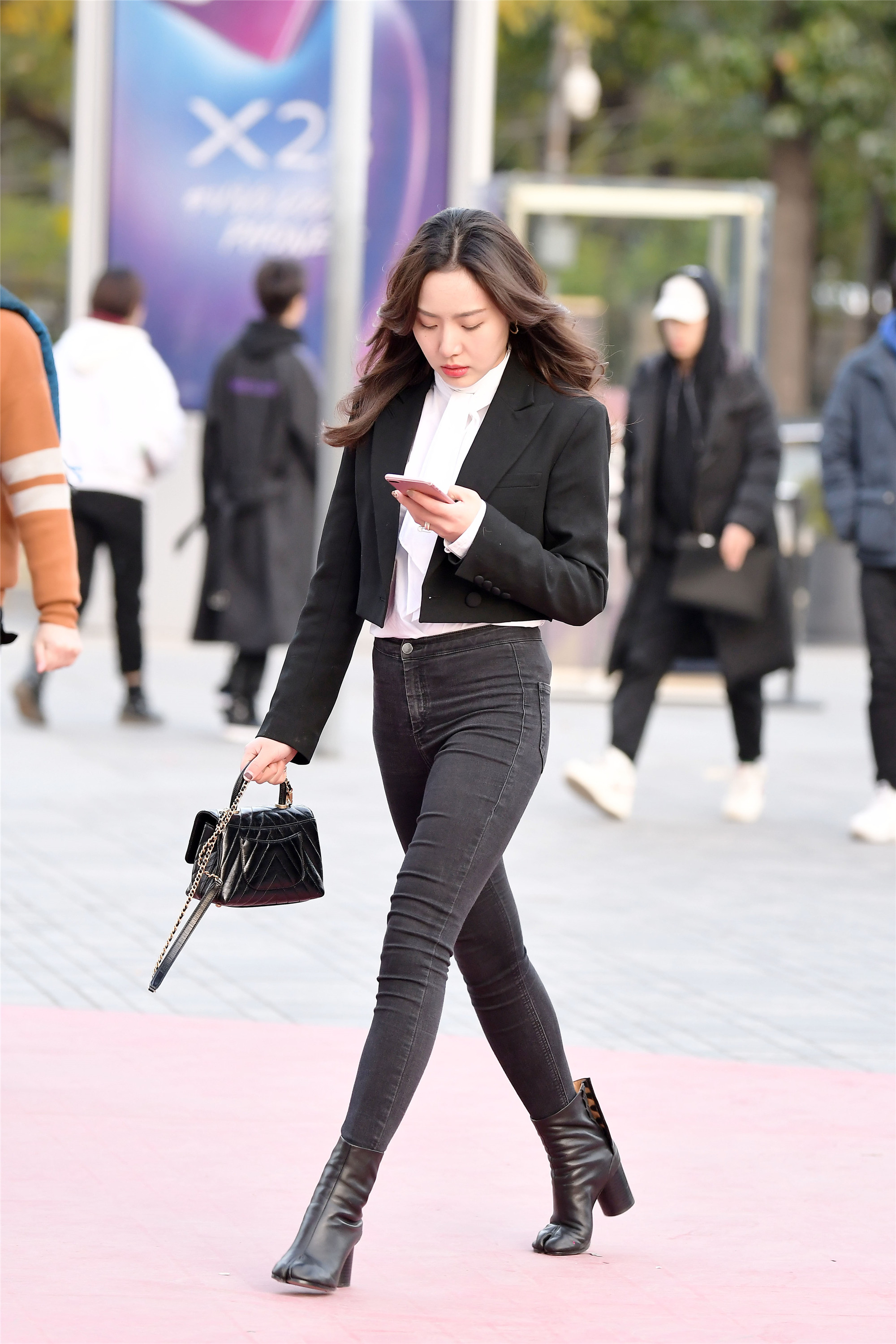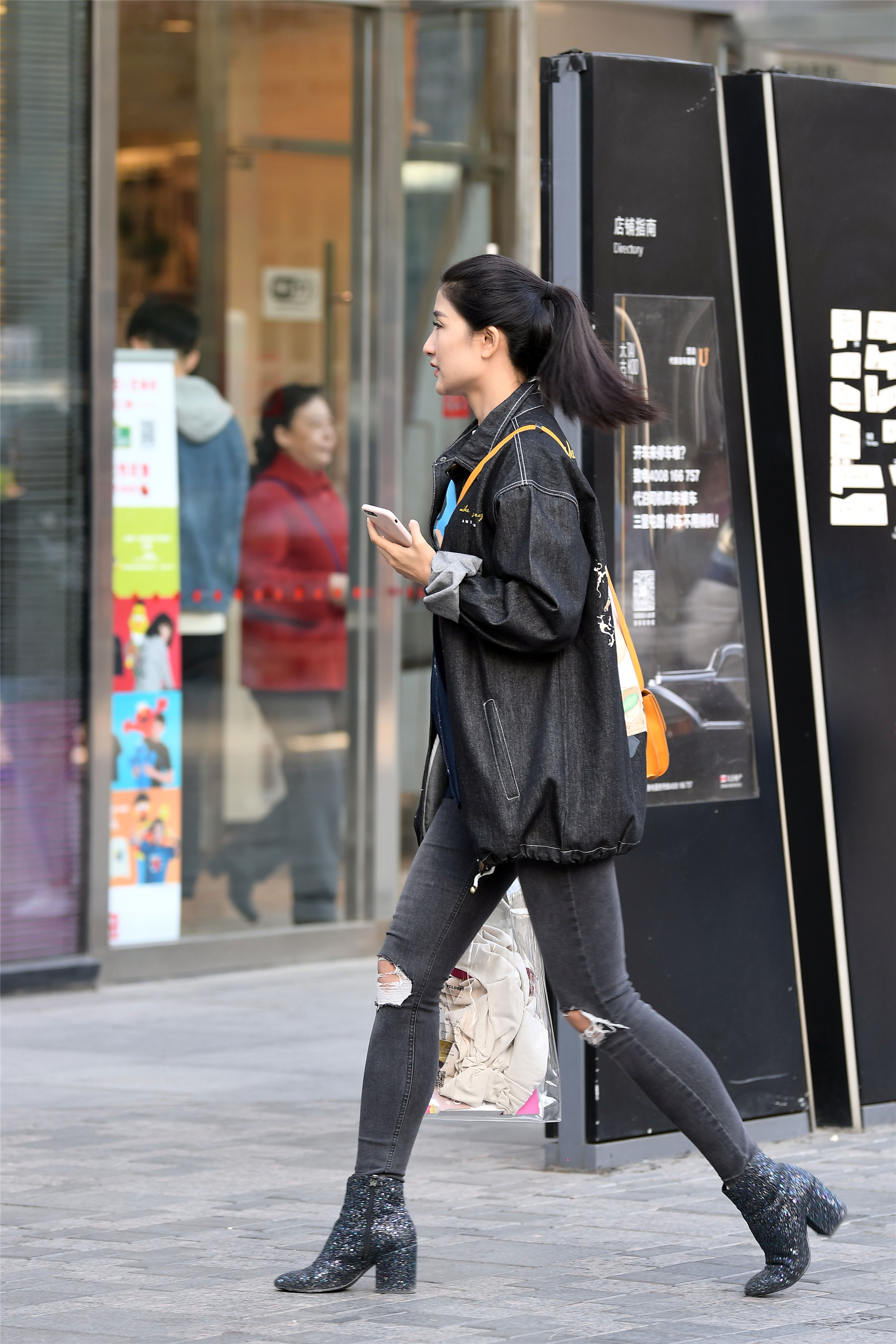 到了秋冬时节,温度在降低,树叶在凋零,时尚街区的行人衣服也在不断的增加,穿着厚实的衣服怎么搭配出时尚来呢,这是考验美女的穿搭时候,牛仔裤在这个季节是最好的搭配时节,修身牛仔裤又能展现个人魅力,搭配一双短靴,和牛仔裤相结合,保暖又时尚,上衣用一件小夹克,会显身材高挑和很好的比例。