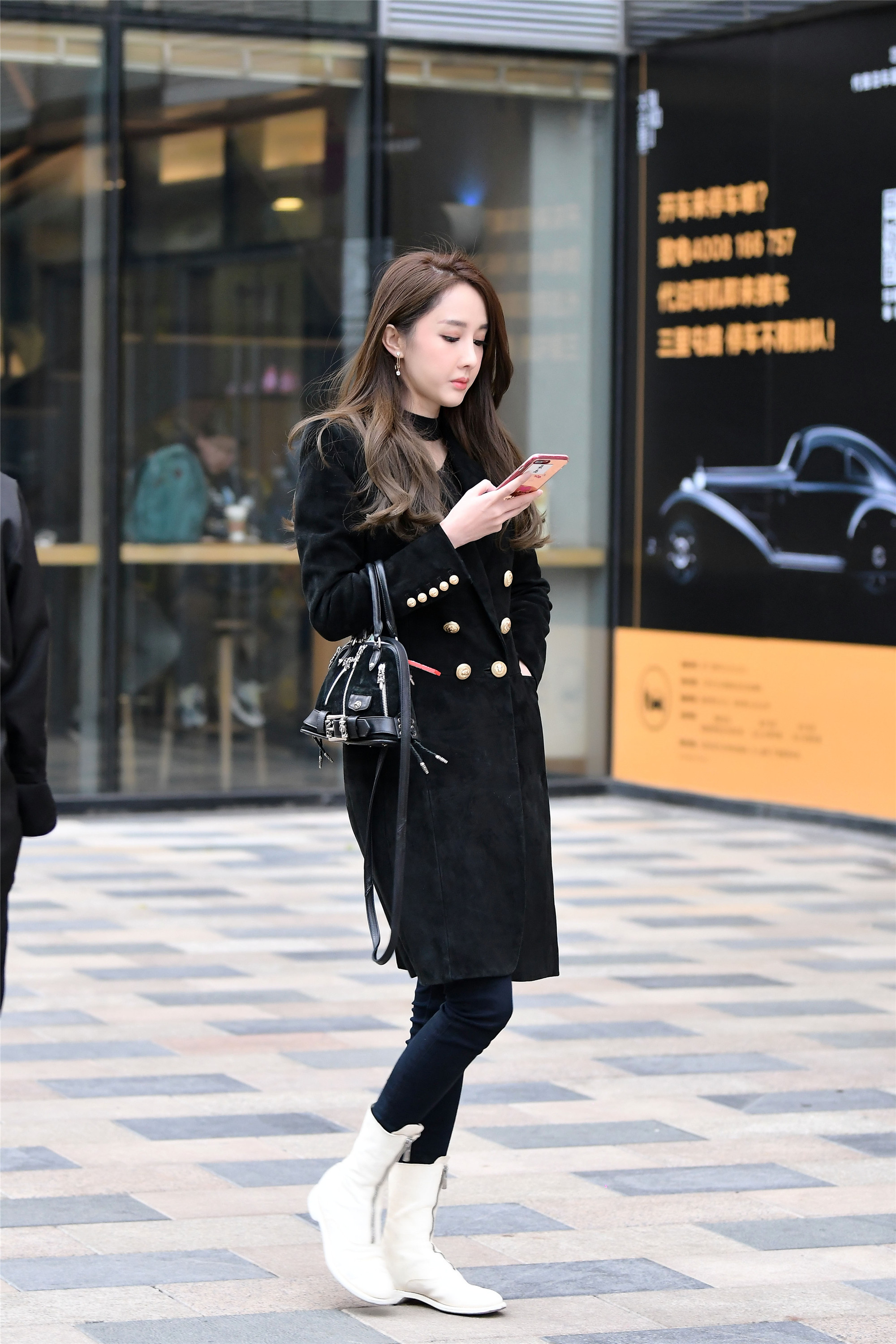 小姐姐这一身搭配,主题是黑色,但是显得很高级,黑色牛仔裤搭配一双时下流行的中间拉链的白色短靴,形成对比色,黑色大衣上点缀着金色扣子,这样的搭配非常漂亮。