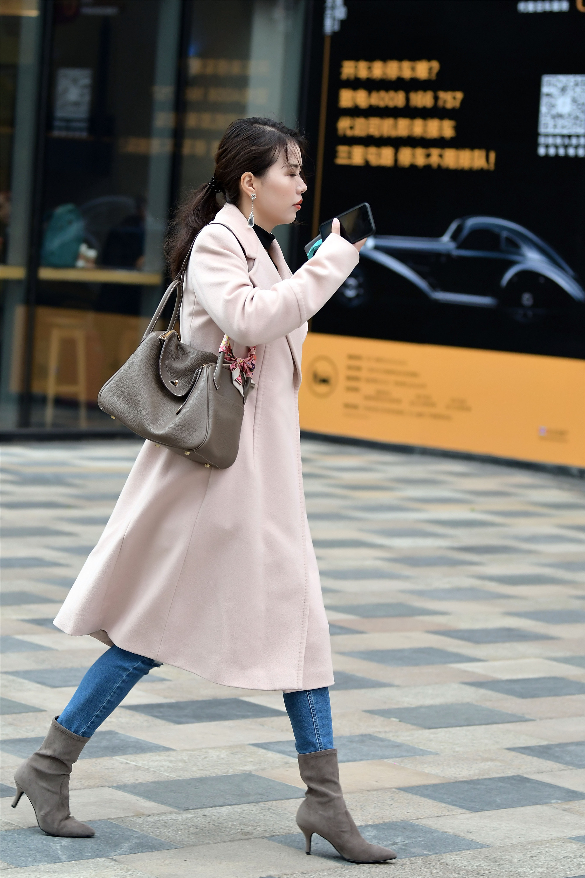 蓝色修身牛仔裤搭配一双灰色尖头细跟短靴,一件藕粉色的大衣,宽松的大摆设计,身材高挑的姑娘可以迈着大步向前走,如果你身材高挑可以尝试一下这样的搭配风格。