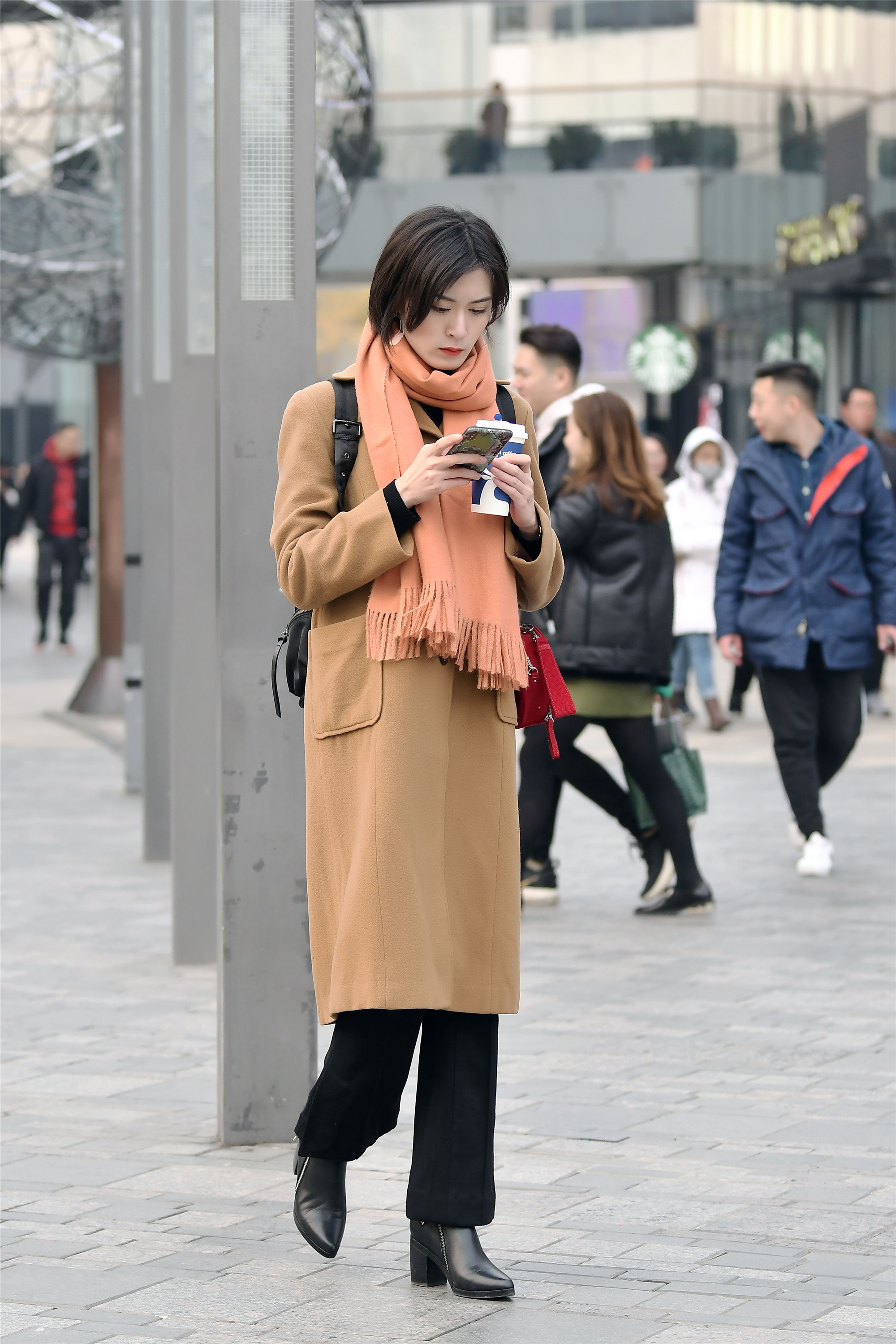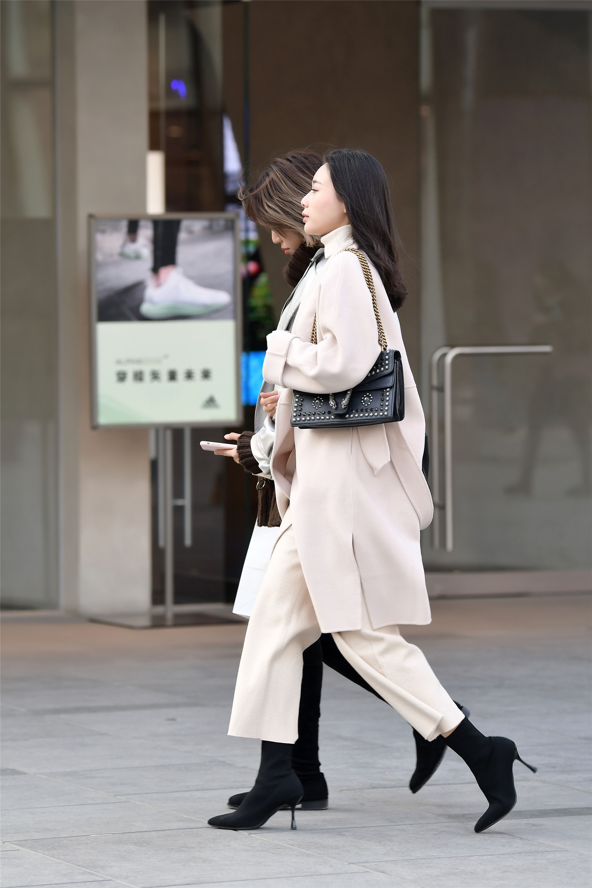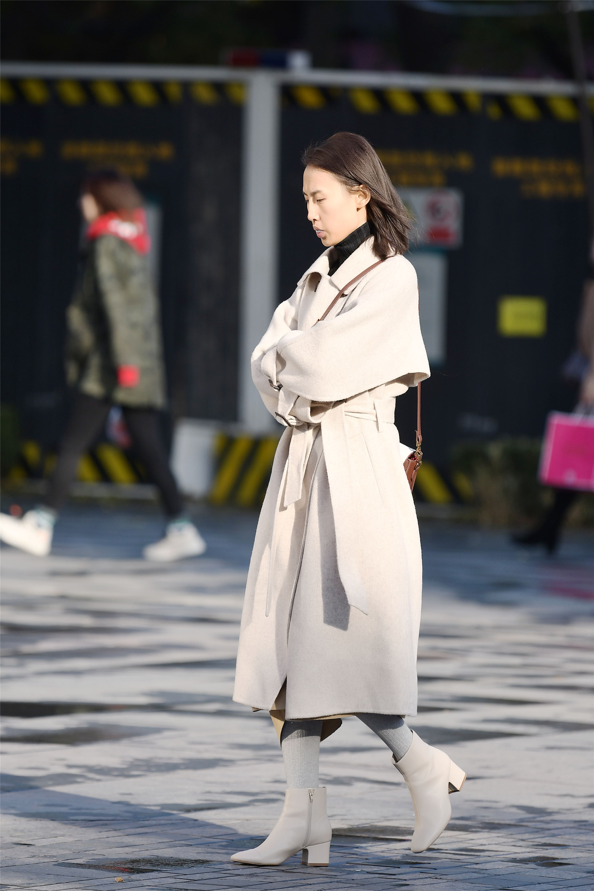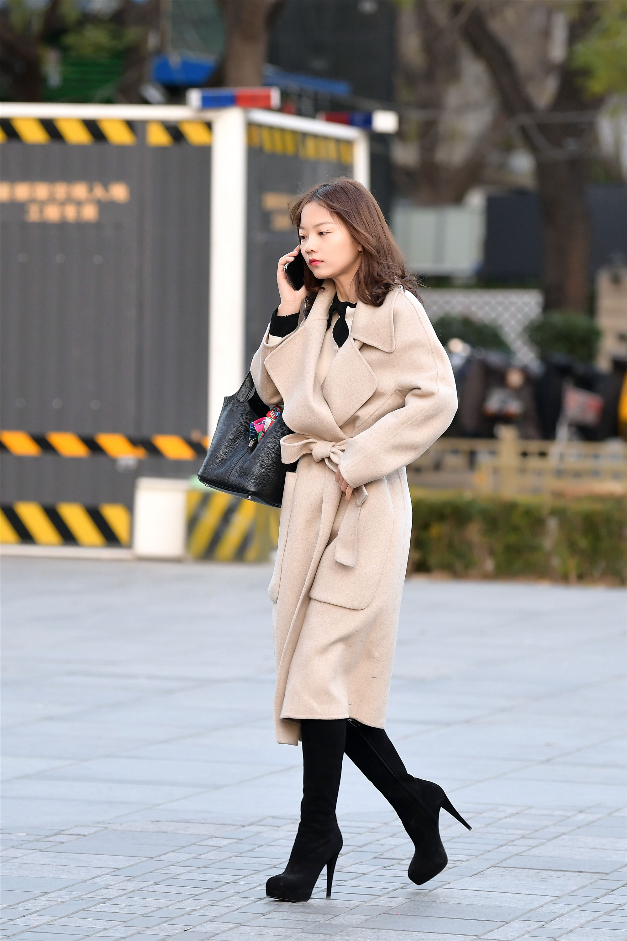 喜欢穿风衣的姑娘,大部分都是那些身材比较高挑的,长款的风衣,更需要身材来衬托,看看三里屯这些时尚的姑娘,她们穿着风衣,让身材更显高挑纤细,而且她们很会穿搭,优雅的气质自然流露出来,米色风衣带着暖色调,一双绒面高筒靴,鞋跟很高,她却走出了优雅的感觉。