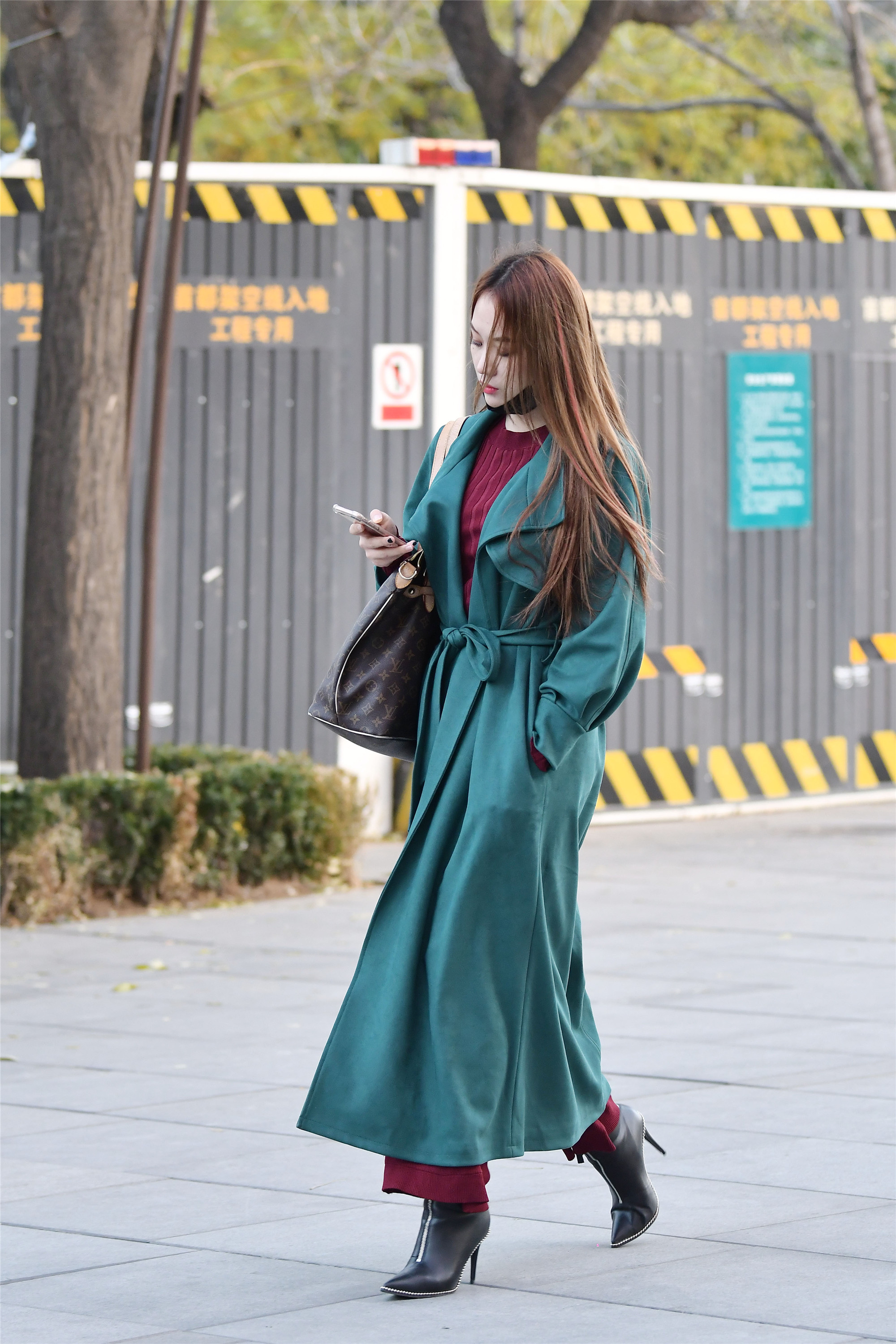 都说时尚搭配的色彩中忌讳红绿在一起,但是这位小姐姐却敢于尝试,而且搭配出来的效果非常漂亮,绿色的长款风衣,很显个性,酱红色的针织衫和酱红色的裤子,酱红色只露出来一点点,这样更像是绿叶衬托红花的感觉,很自然的穿搭,一双黑尖头细跟短靴,更是衬托她的气质和身材。