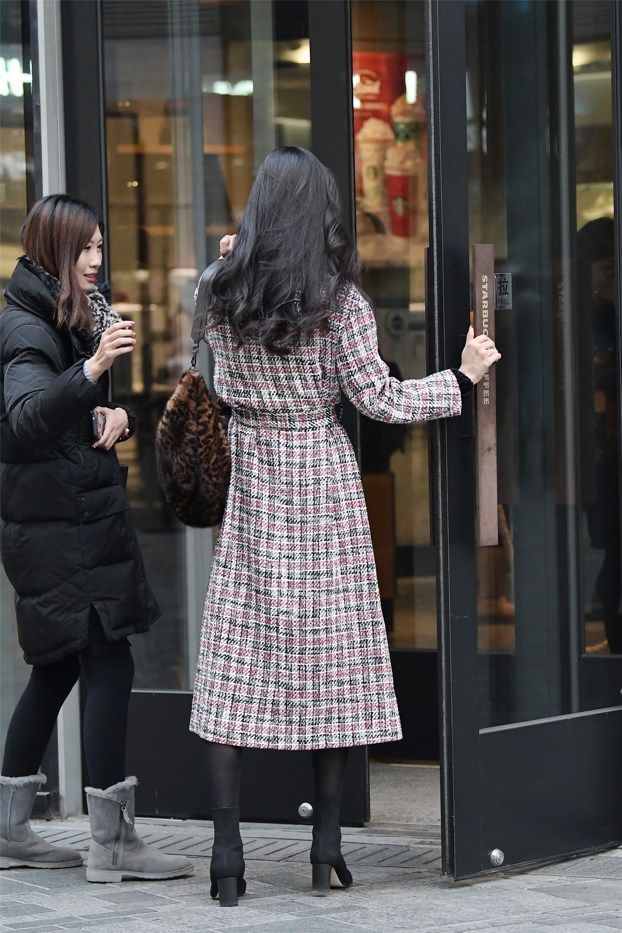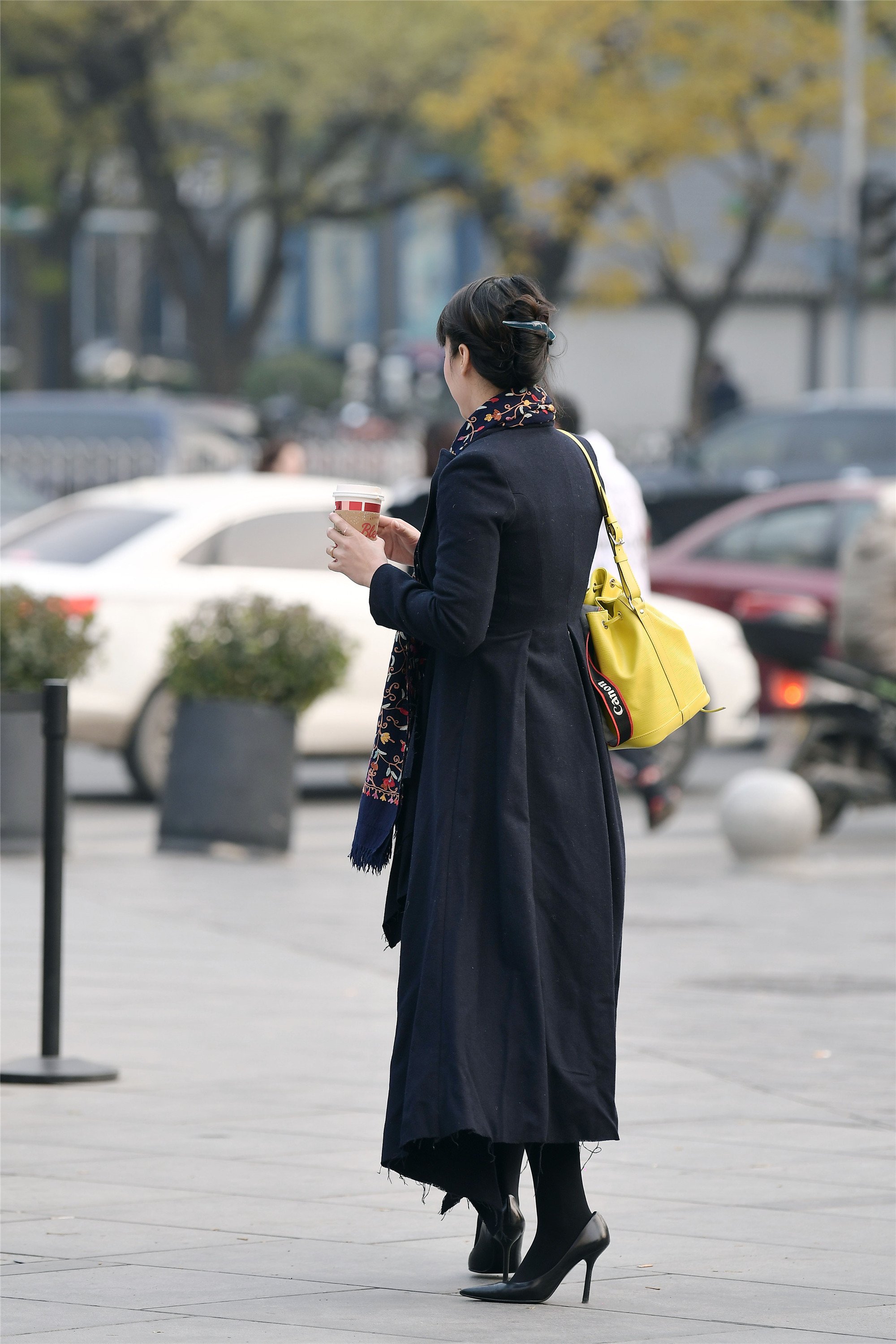 黑色羊绒长款的大衣,虽然没有腰带,但是却设计腰线位置,会让你显出很好的身材比例,还穿着一双黑色尖头细高跟,让身材更挺拔,显气质,这样一身黑色搭配,让你感觉很惊艳。