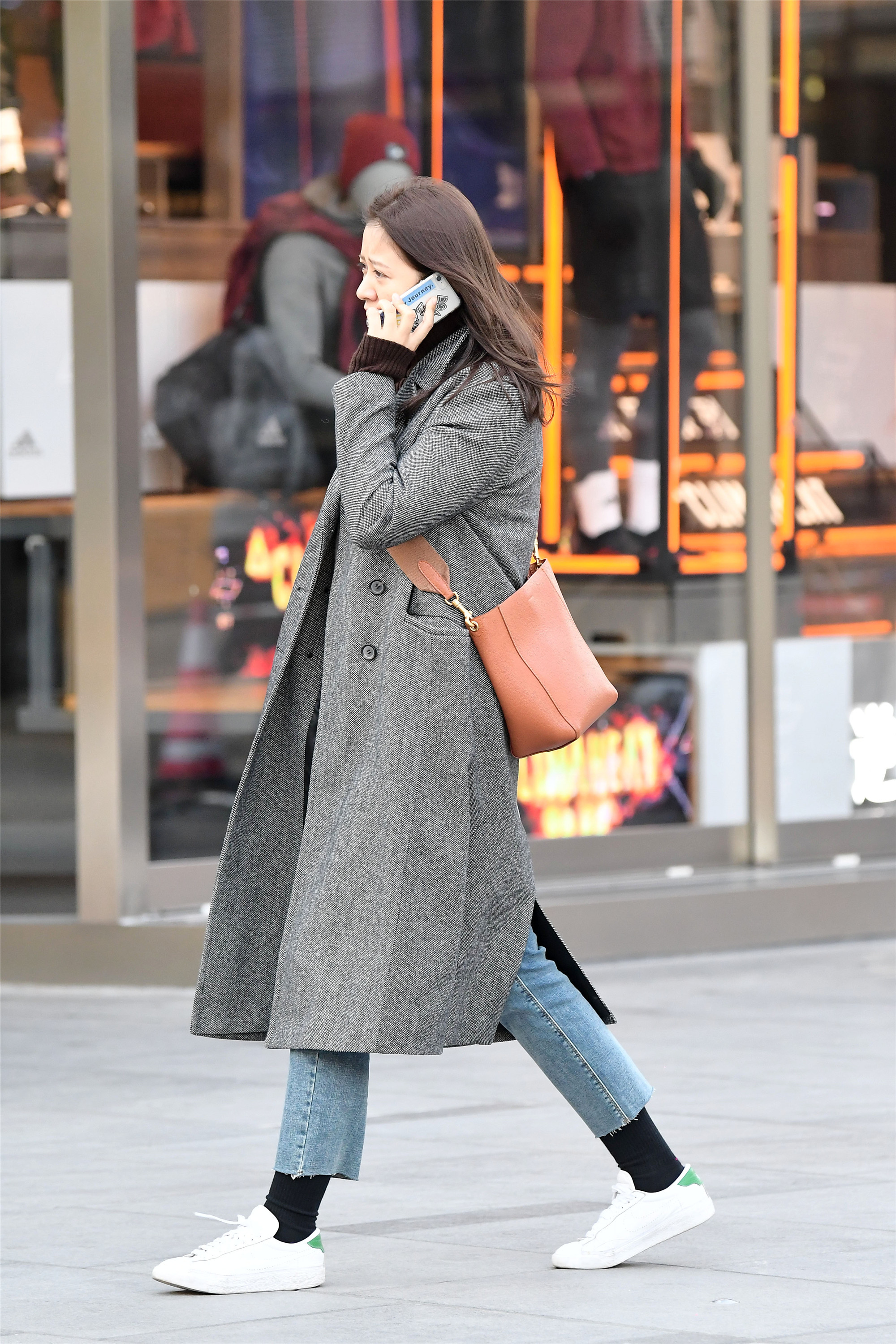灰色的长款风衣,搭配牛仔裤和一双小白鞋,很保暖的搭配,这样简单的搭配,适合很多人,服装都是大家衣橱里面常备的,即使你不是很会搭配,也可以尝试这样穿搭出门,慢慢的你的搭配会越来越好,也会找到符合自己的搭配方法。