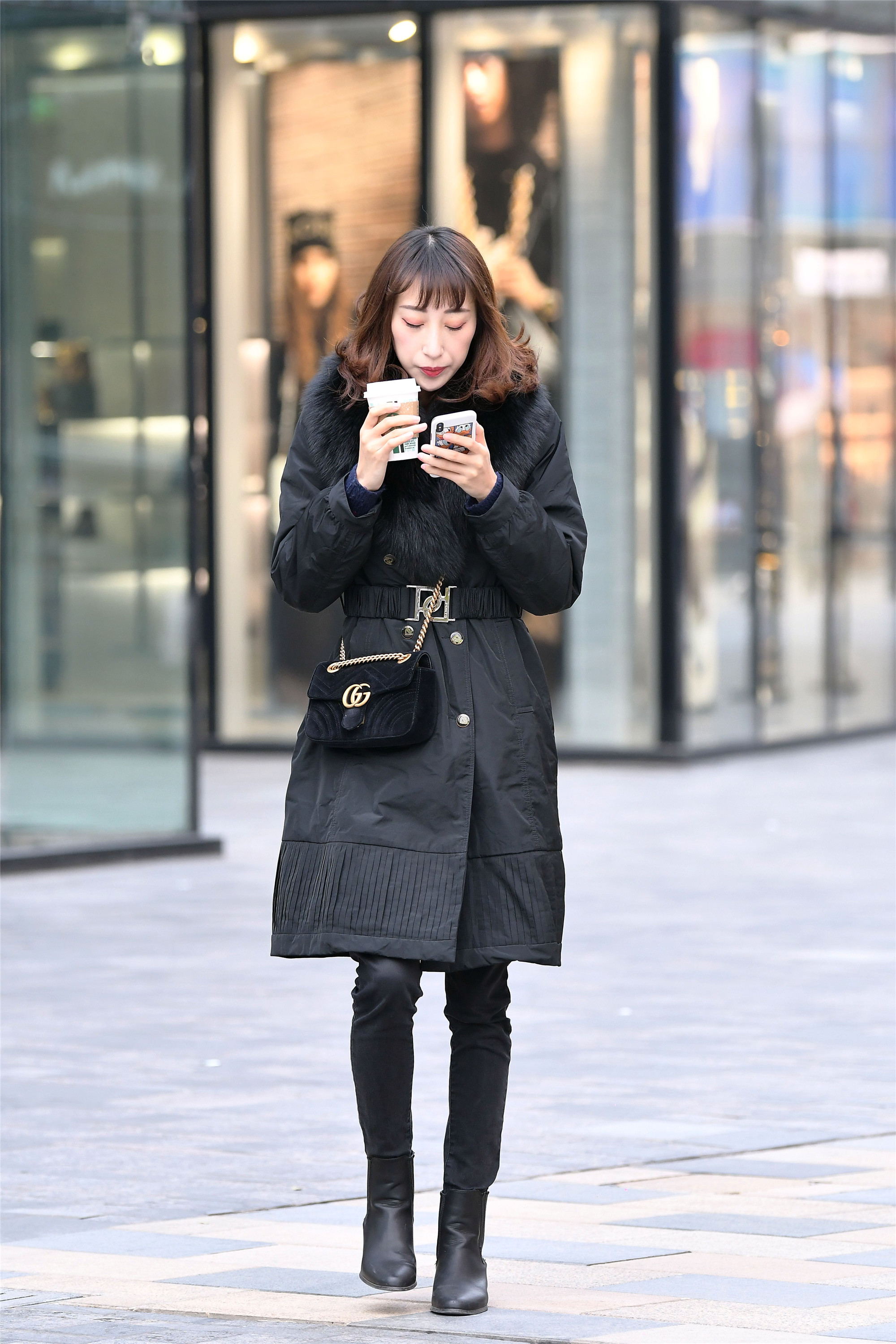 中长款的大衣,腰带系起来,会更突出身材比例,而且一身黑色搭配,还很有层次感,姑娘身材很瘦,即使穿着修身的裤子,依旧能够看到裤子的褶皱,选择一双皮质短靴,增加质感。