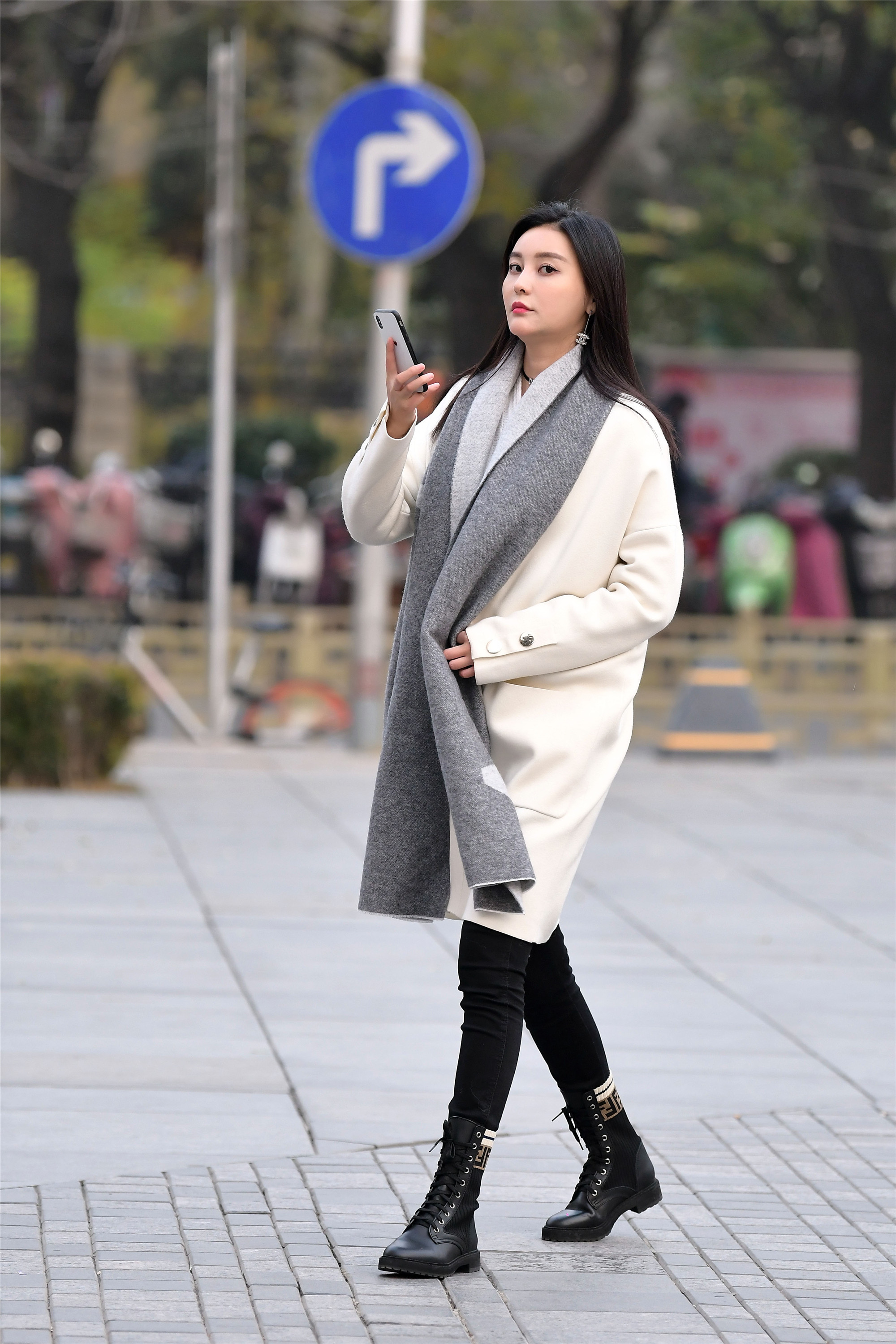 米白色的风衣搭配一条灰色围巾,很有层次感,黑色修身裤和脚下一双马丁短靴,更显青春的搭配,不需要穿高跟鞋逛街,这样搭配更显得自由自在,休闲感觉十足。