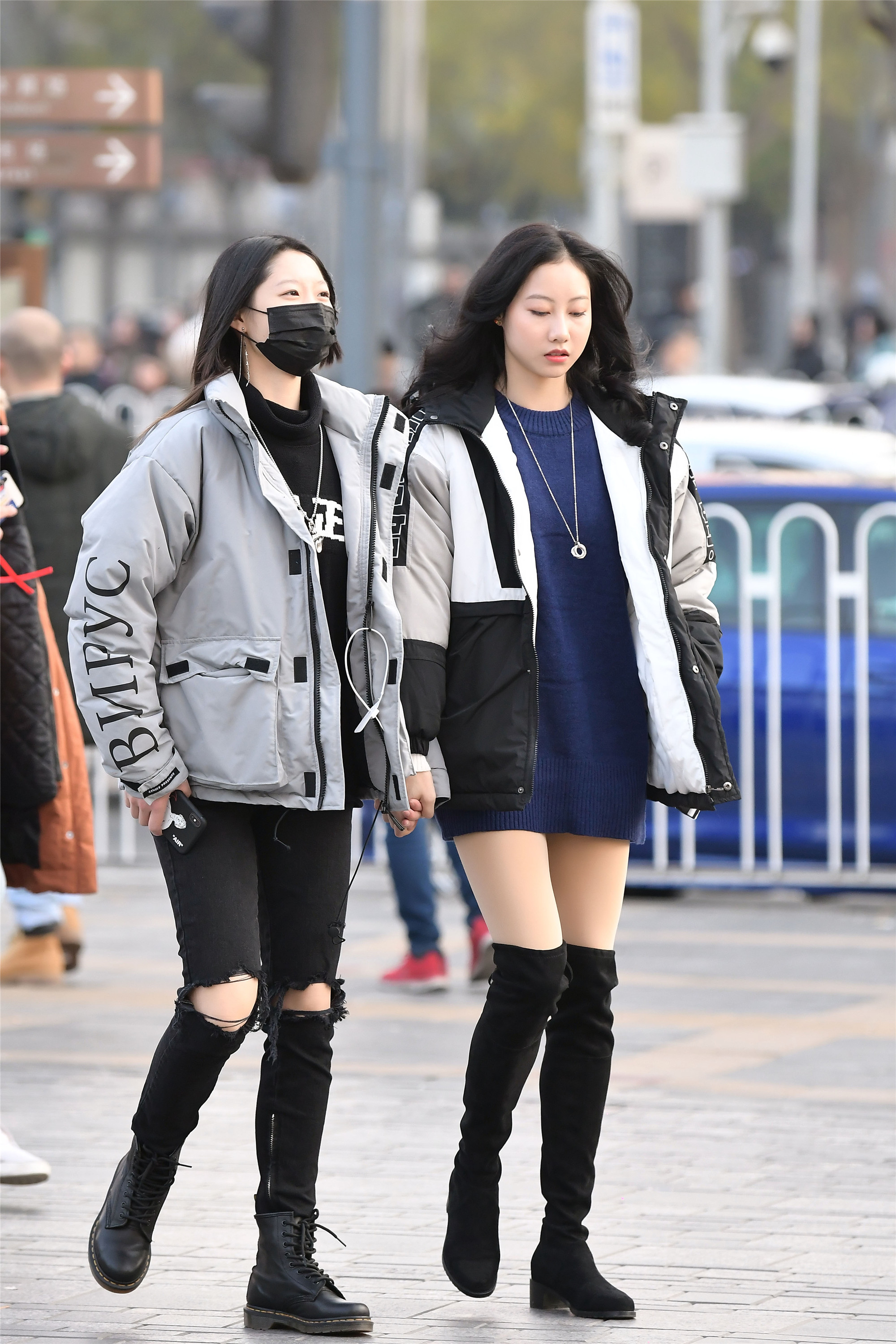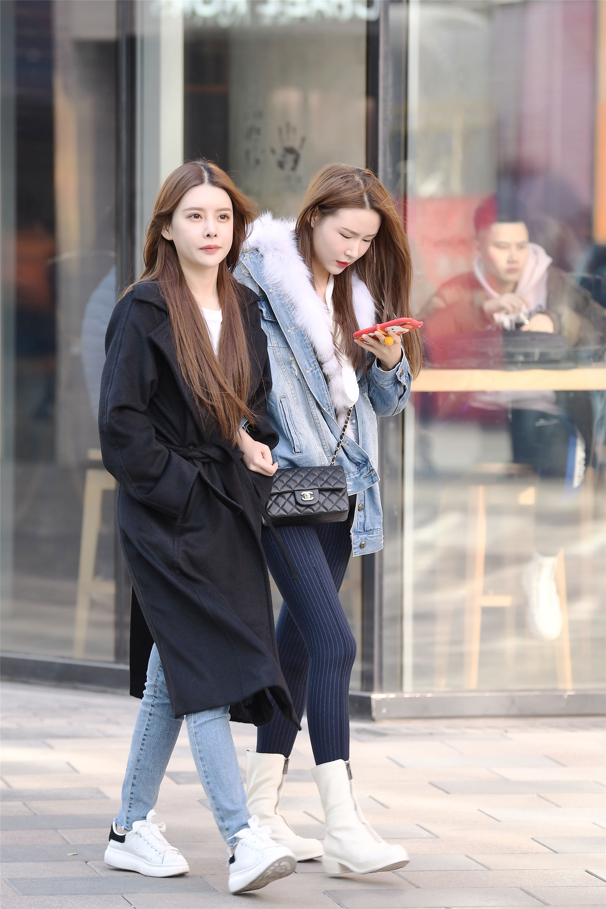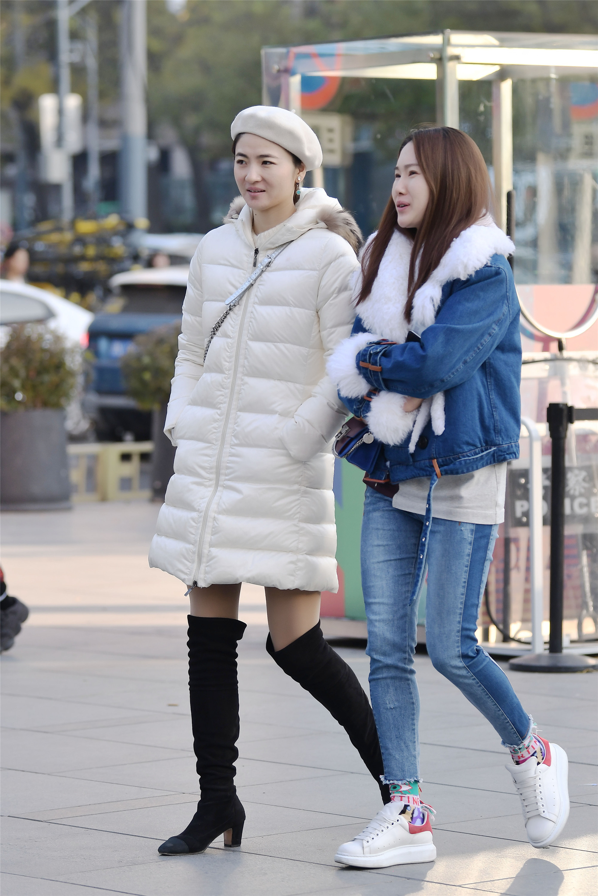虽然闺蜜之间关系很好,但是最好不要穿着同款的搭配,要有自己的特点,这样会各有春秋的味道,中长款的羽绒服搭配黑色过膝靴,而她的闺蜜却搭配着牛仔系列,牛仔裤与牛仔夹克,这样搭配就互相衬托了。