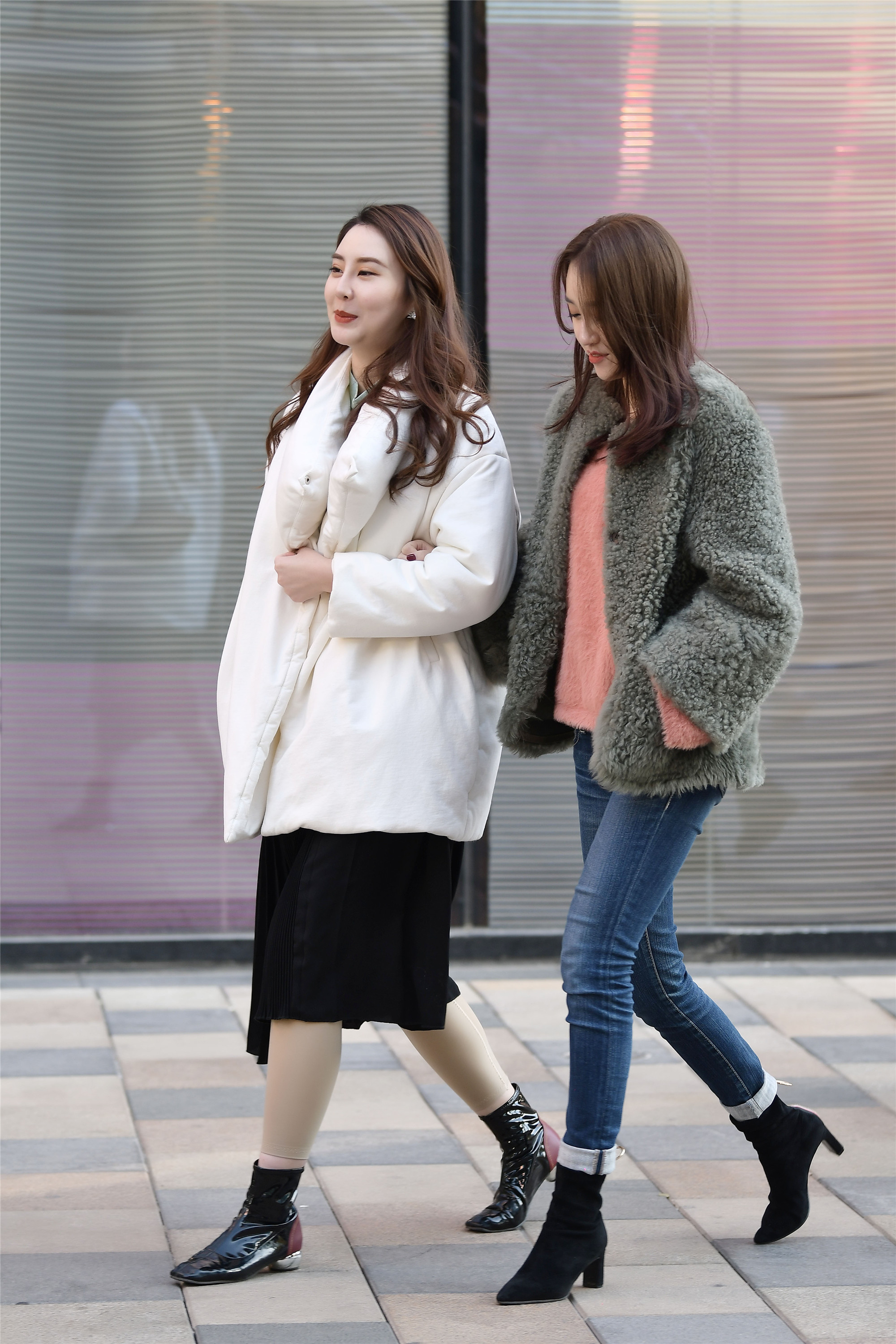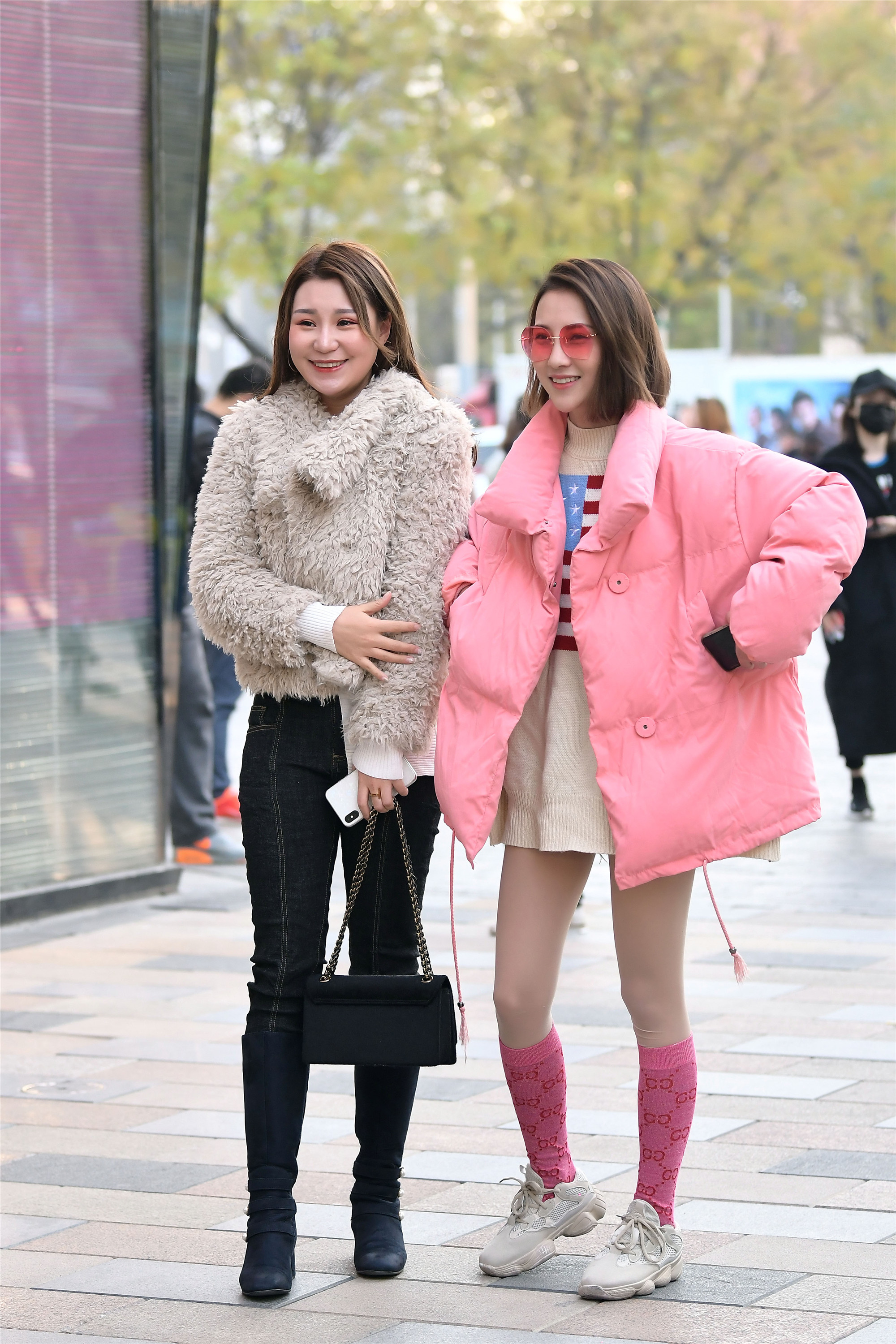 粉色短裤羽绒服搭配着一件长款的针织衫,高筒足球袜搭配一双运动鞋,显得个性十足,她闺蜜是一件仿皮草的小外套,黑色牛仔裤搭配一件黑色高筒靴,看她们开心的笑容,也会感染你,不自觉的笑出来。