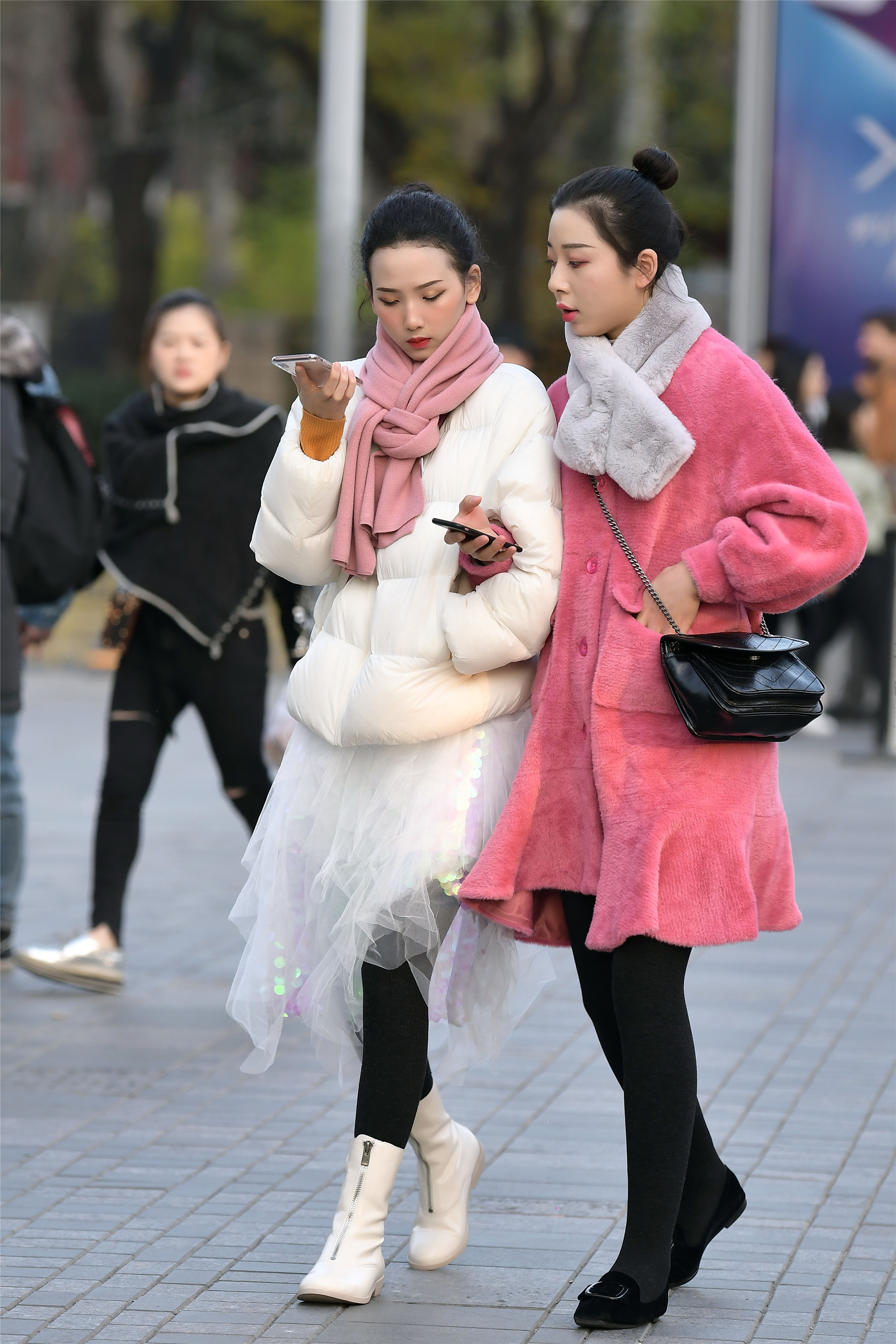 深秋时节如果穿着粉色出门,是很显眼的,在衣裙黑色行人之中,穿着一件粉色摇粒绒大衣,荷叶边的下摆,保暖有容易让人记住你,特别是她的闺蜜白色羽绒服和白纱裙来衬托她,这样的一对闺蜜从你面前经过,很漂亮吧。