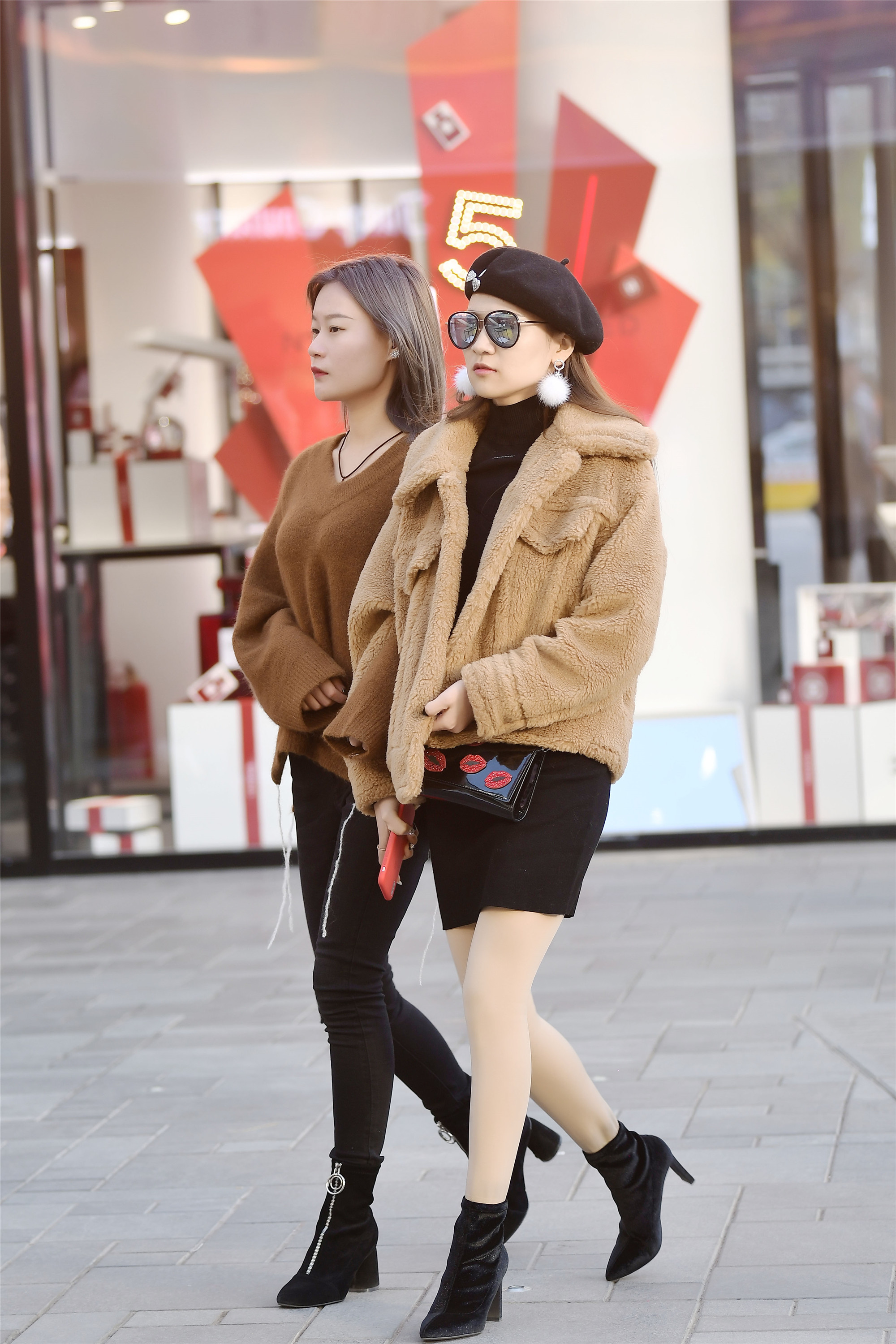 闺蜜之间的搭配,可以有相似之处,又可以带着不同的个性,裙子和裤子的对比,会让你们之间互相衬托一下,摇粒绒上衣和针织上衣,相近的色彩似乎是她们出门前商量好了的,黑色短靴也是她们相似的搭配之一,却又带着一点小个性。