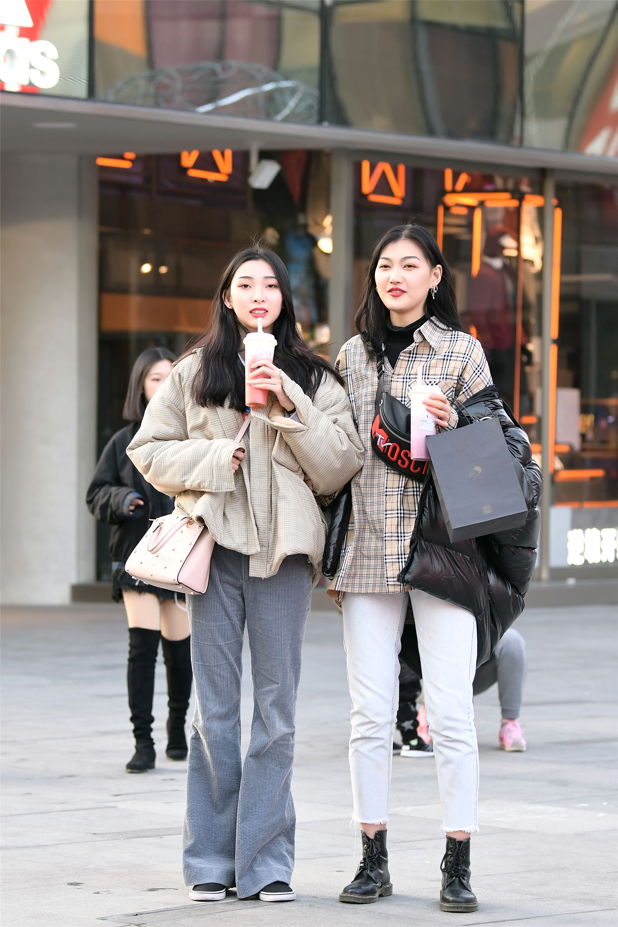 两位漂亮的姑娘,看着很眼熟,应该给她们拍过照片,她们也很喜欢拍照,今年很多人都穿这种格子衣服,带着一点偏灰的色调,细条绒有流行回来,却让你感觉更高级的色调,闺蜜之间可以穿搭很简单,她们逛街可以互相交流一下搭配心得。