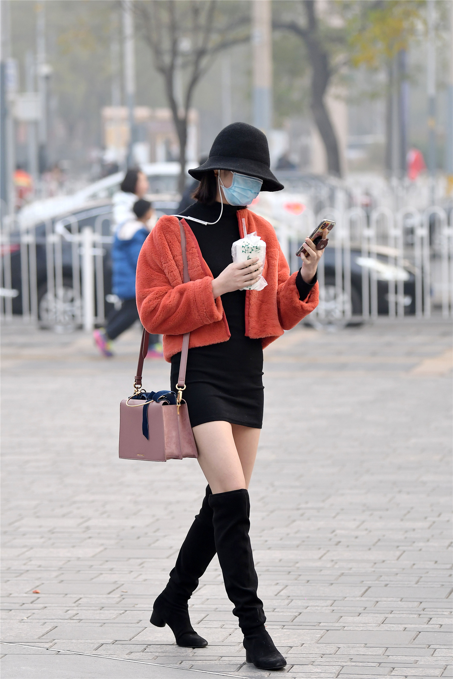 秋冬时节,红色是必不可少的色彩,与红色最好搭配的是很色,所以这位姑娘也很会选择,红色摇粒绒短裤外套搭配黑色针织连衣短裙,一双黑色高筒靴,搭配出很显身材,色彩还非常漂亮。