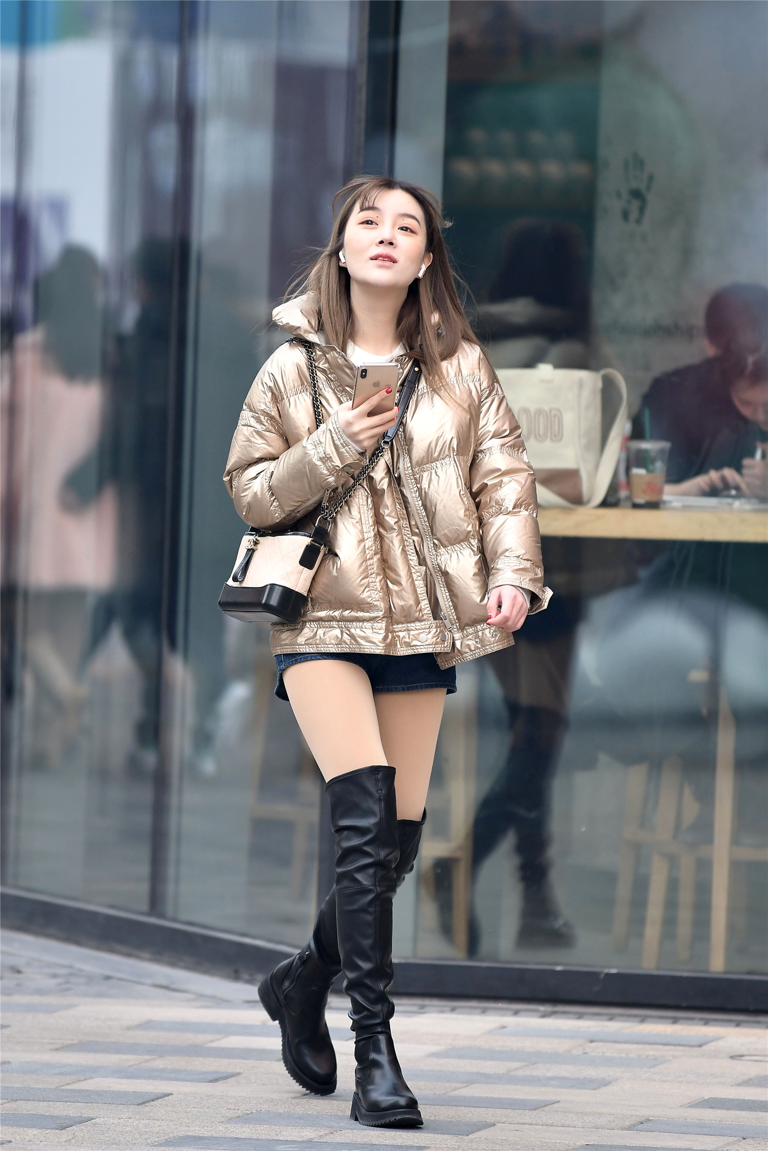 每一年到了秋冬季节,时尚街区的行人也会大量减少,出门的时尚姑娘虽然不多,但是她们总能搭配出不一样色彩来,让你感受这秋冬的搭配魅力,这个时候也很考验时髦的姑娘搭配技巧,这一款暗金色调的羽绒服,带着低调中有带着华贵的感觉,搭配一双黑色过膝靴皮靴,色彩上非常漂亮。