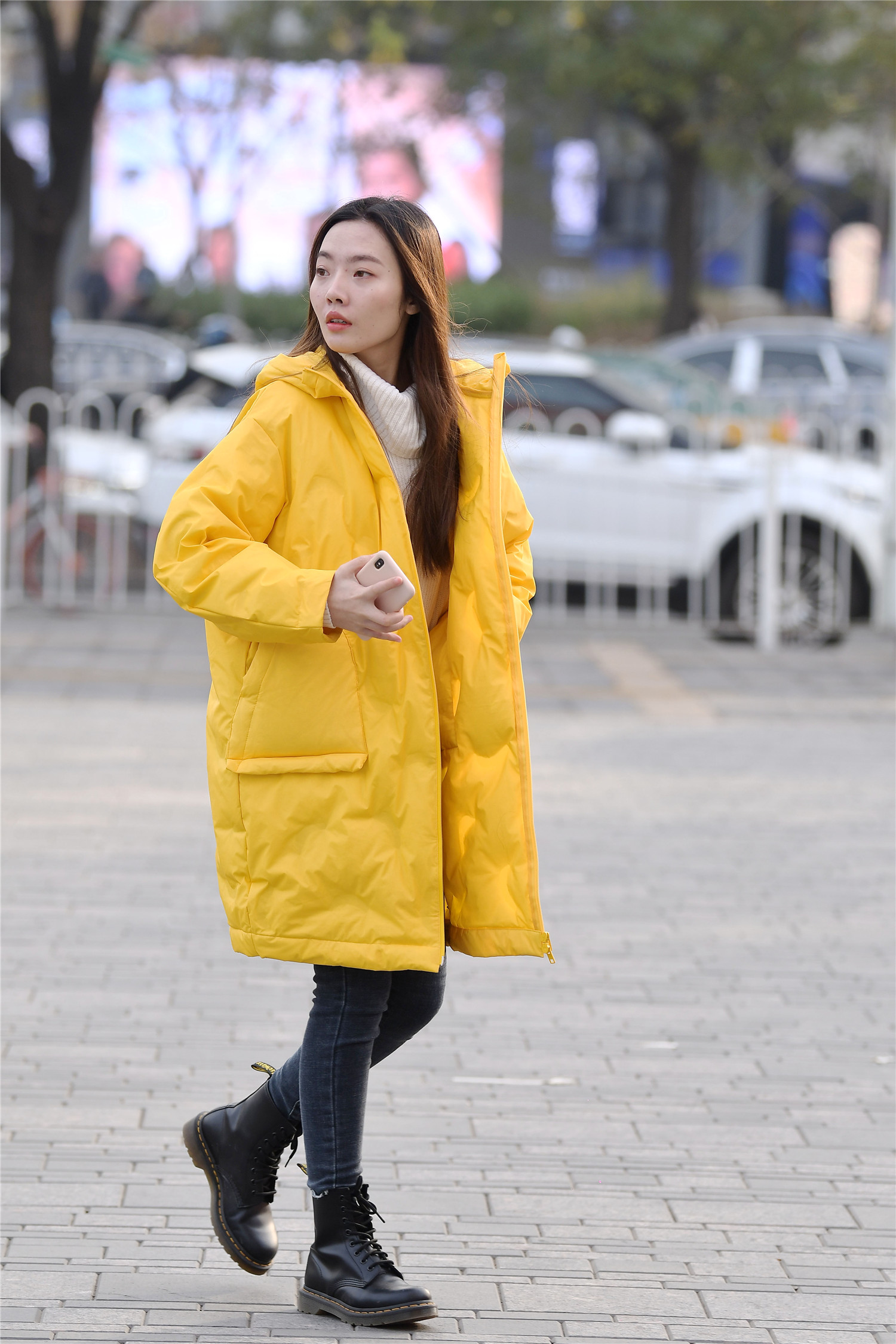 黄色也是非常容易搭配的色彩,秋冬时节选择一款黄色的羽绒服,也是很不错的,而且搭配白色和黑色都可以,她搭配一条黑色牛仔裤,一双马丁短靴,也是很不错的搭配。