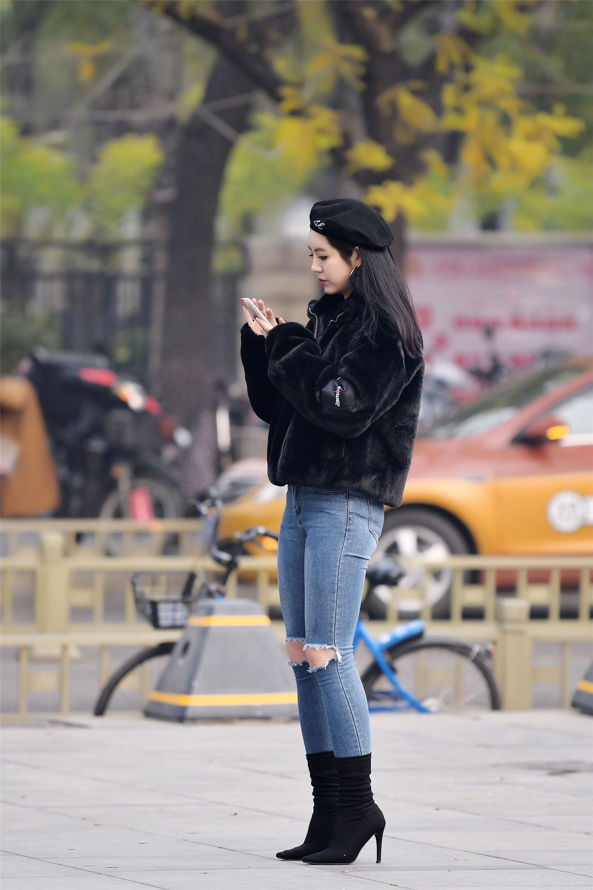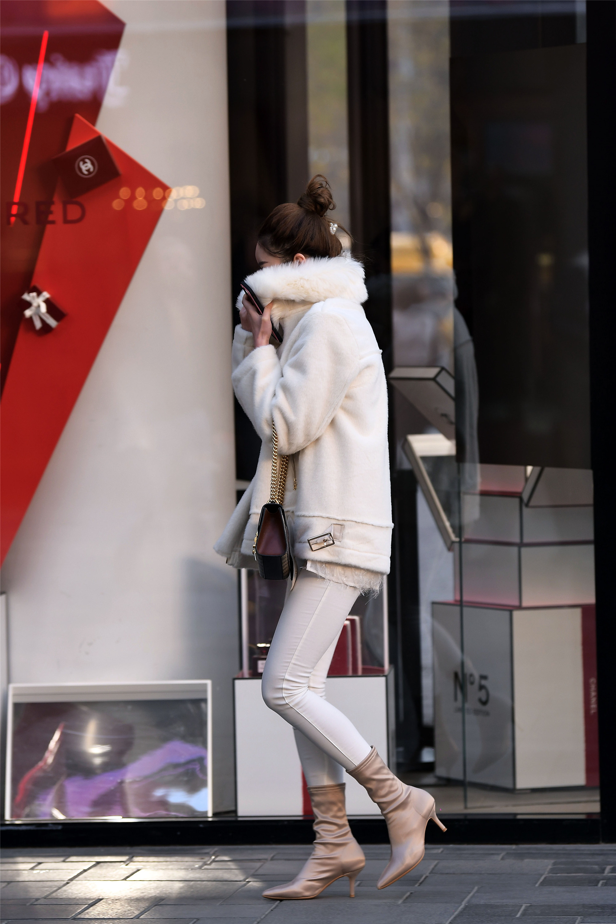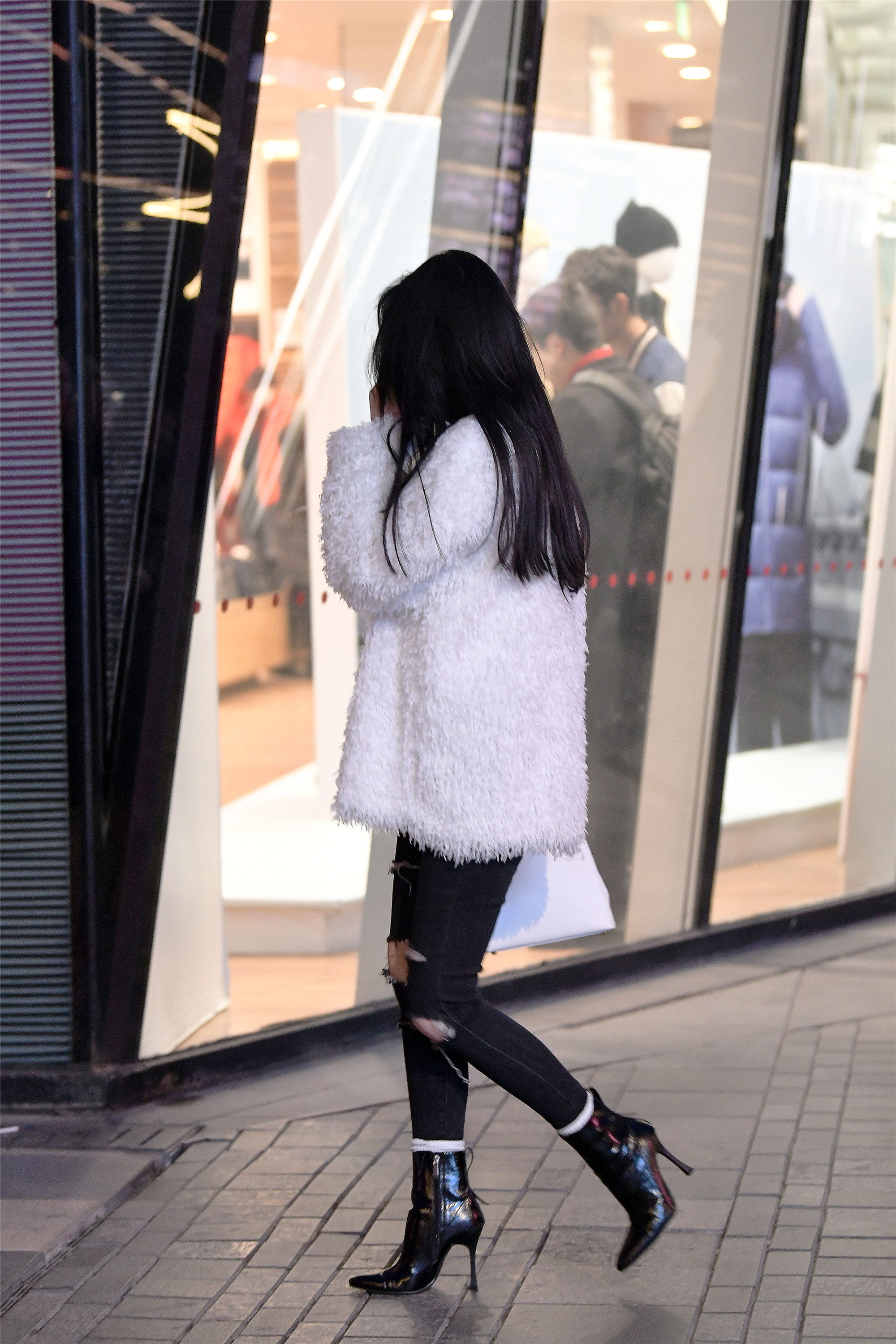 黑色尖头细跟短靴,漆皮材质非常漂亮,带着反光的感觉,黑色破洞牛仔裤依旧在这个季节很流行,一件白色仿皮草外套非常,非常喜欢小姐姐这样穿搭,显身材高挑和纤瘦。
