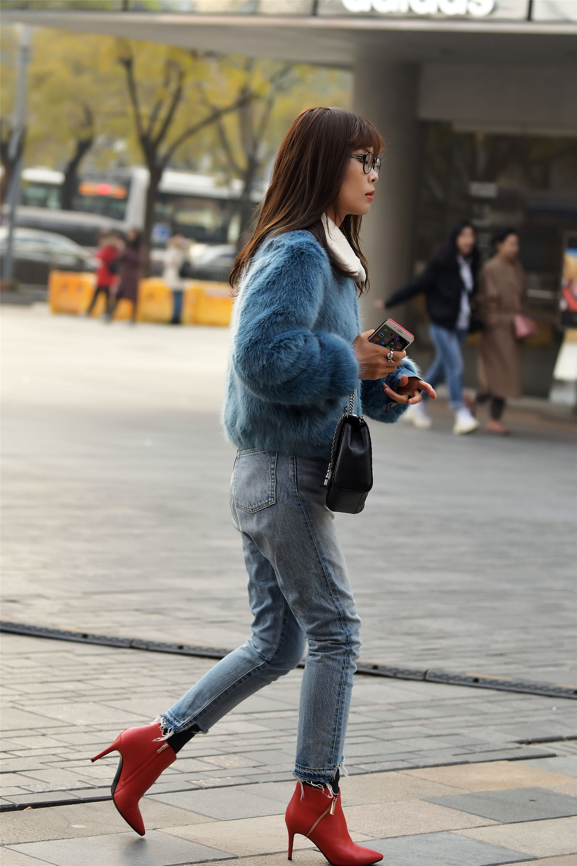 红色尖头细跟短靴,穿的人不多,真皮质感非常舒适,搭配一条牛仔裤,虽然不是修身的款式,但是也非常显身材,蓝色皮草外套,更显得时尚个性,秋冬时节这样搭配保暖效果很好。