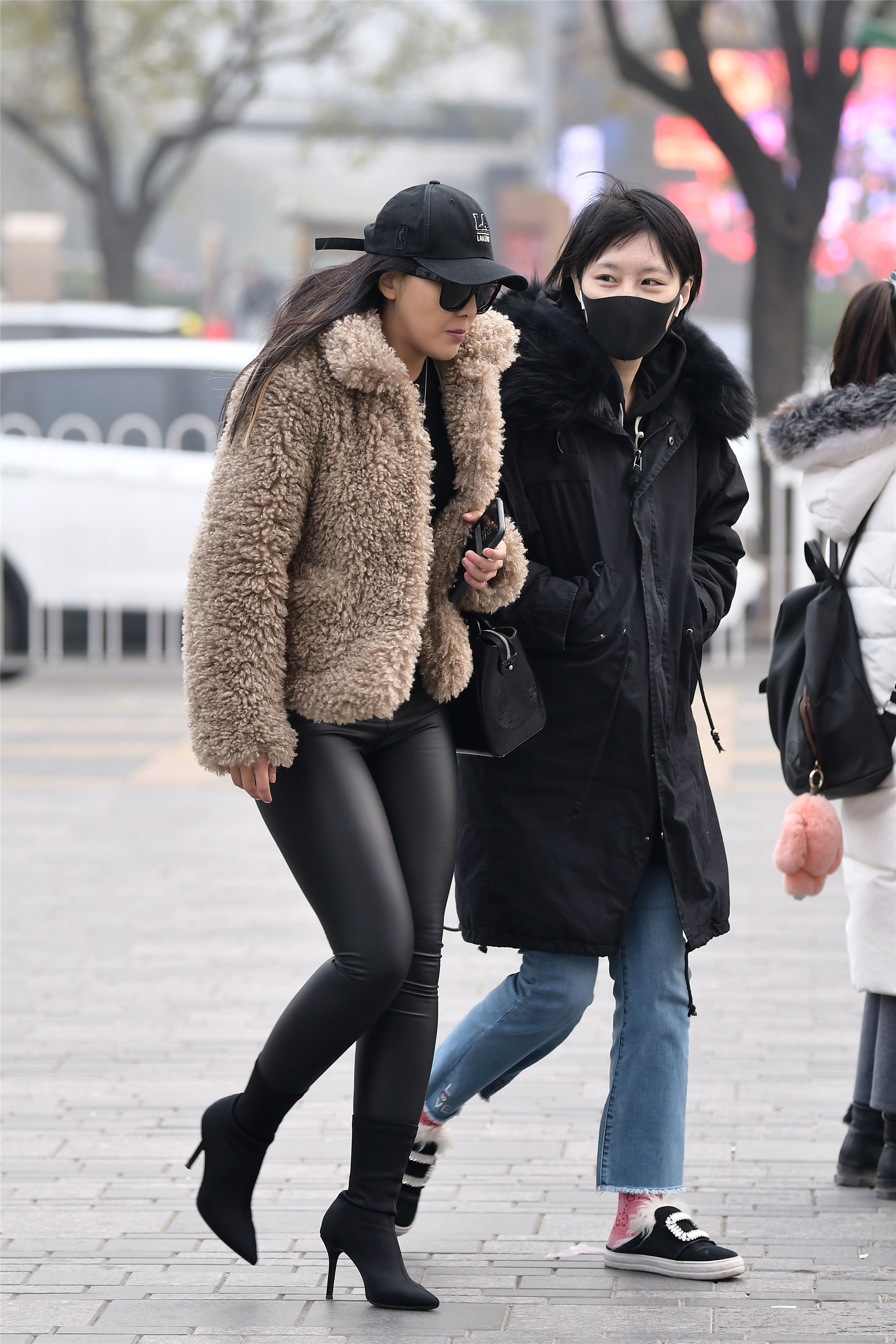 黑色作为秋冬时节的主打色彩,不容易搭配出时尚个性来,一双黑色绒面尖头细跟短靴搭配一双黑色修身皮裤,将小姐姐身材衬托的非常好,羊羔毛的外套,毛绒绒的感觉非常保暖。
