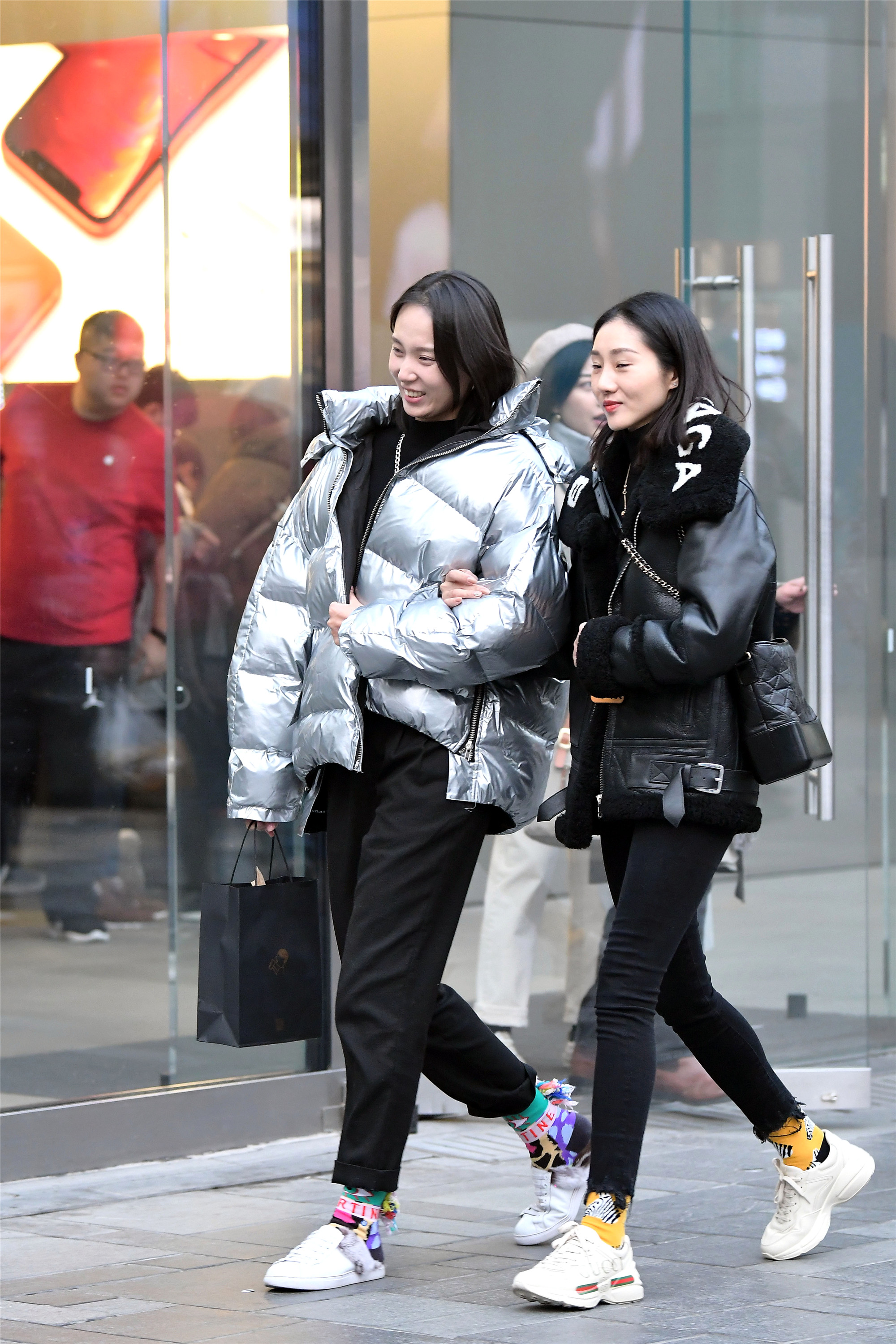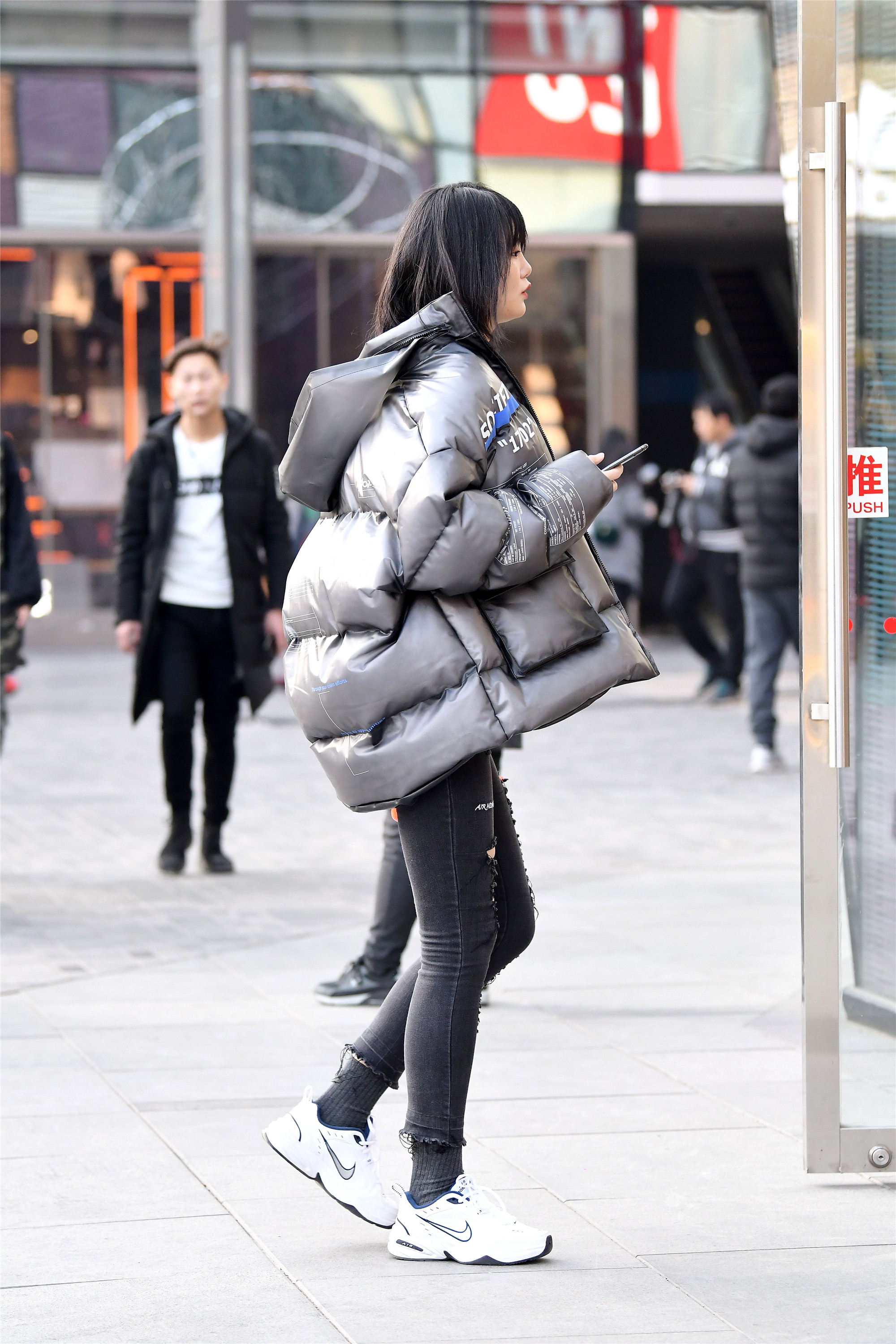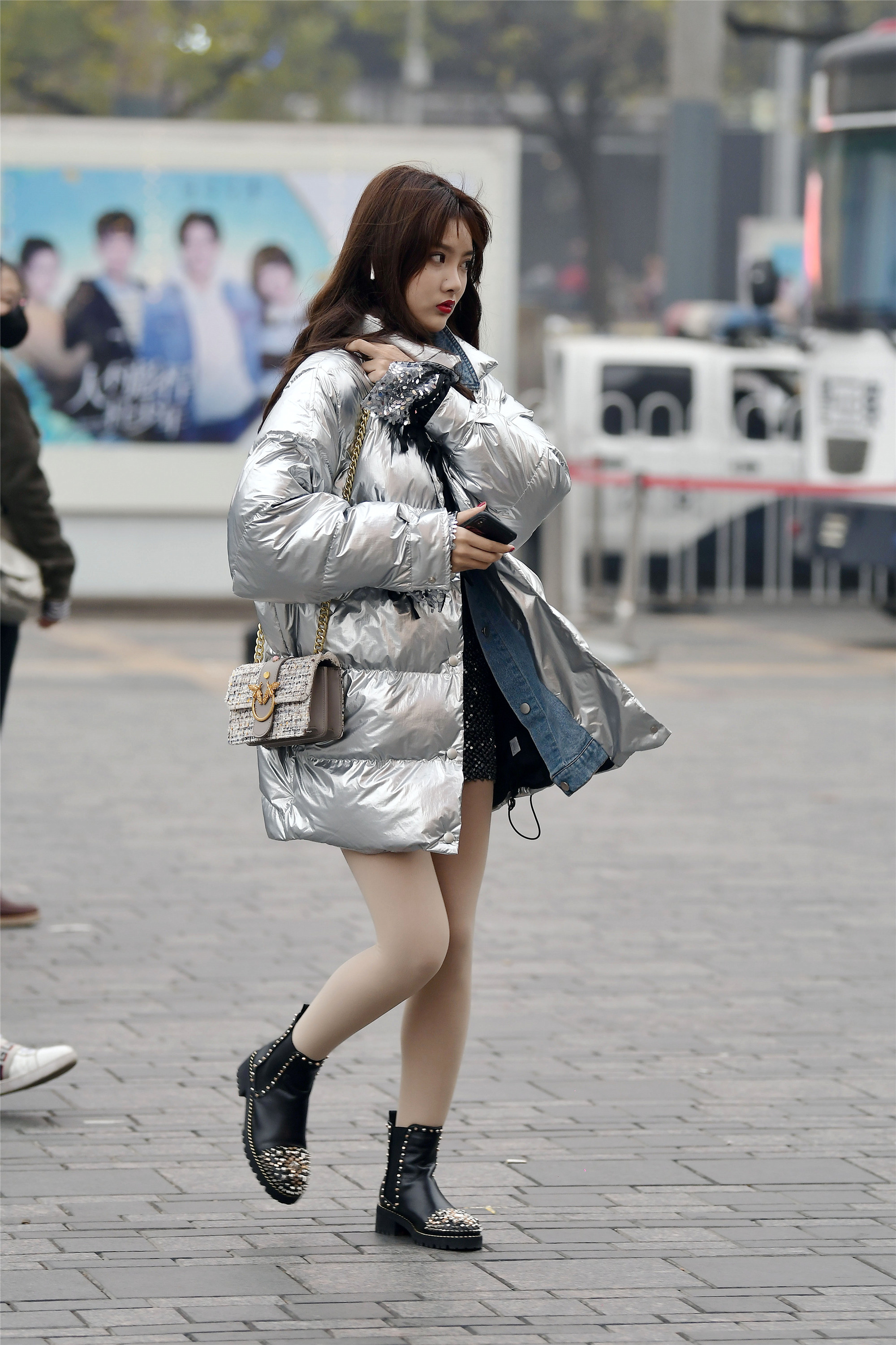 这款银色羽绒服,不是特别的亮,似乎特地压低了色调,看起来会显得低调一些,宽松的款式却用了不对称的设计,而姑娘有没有把拉链拉起来,这样看着会更有层次感,与她的闺蜜穿的皮夹克恰好形成了两种风格。