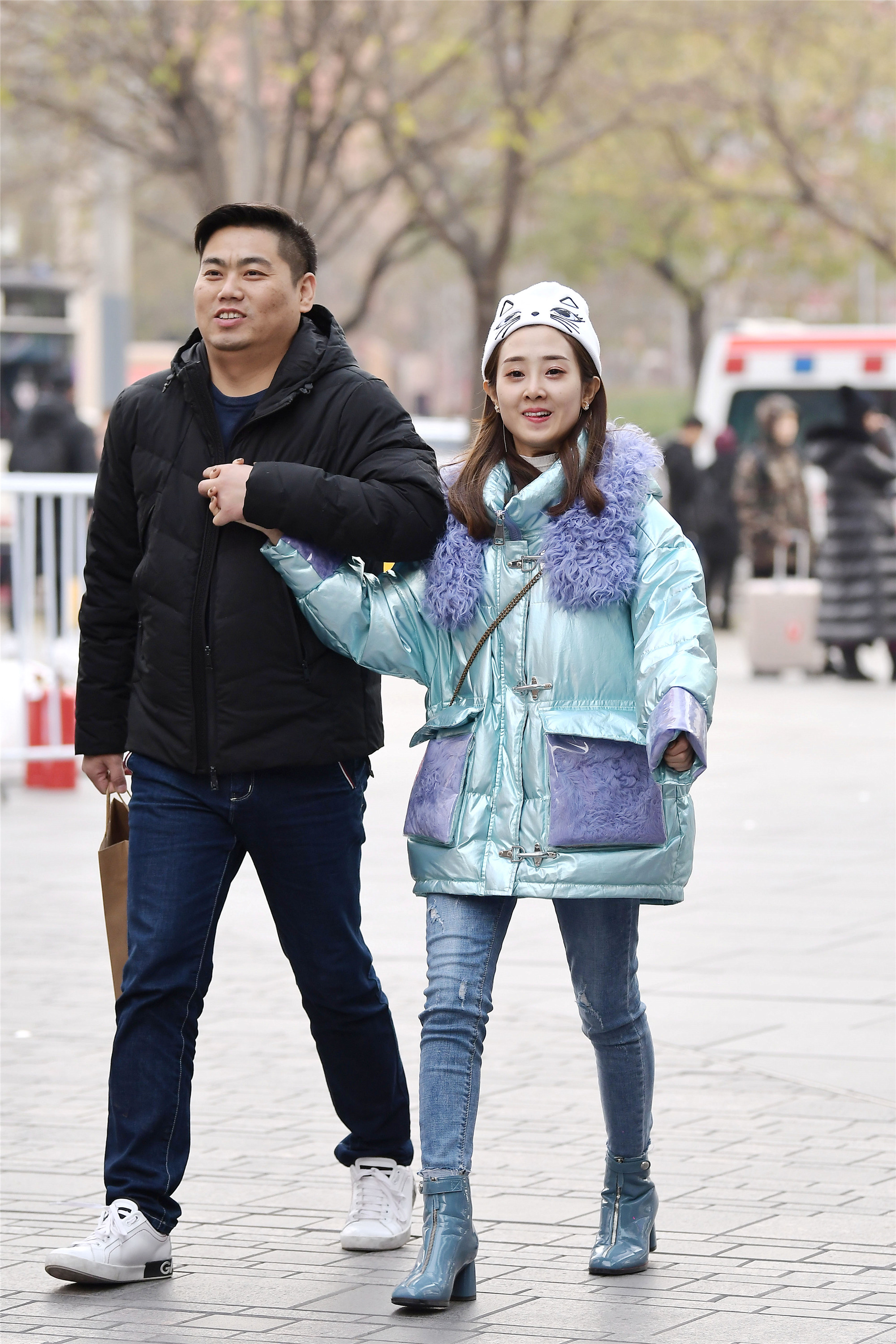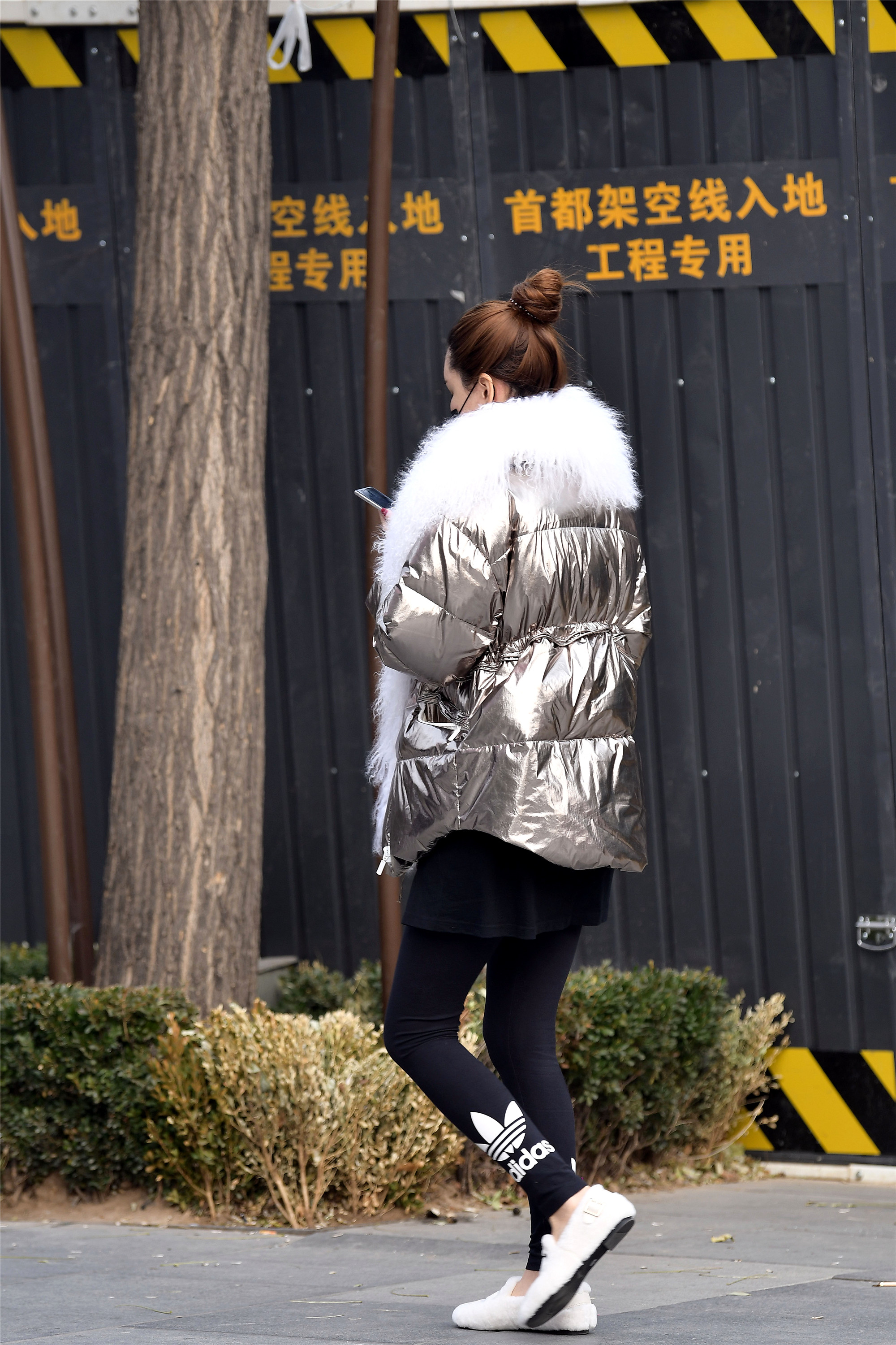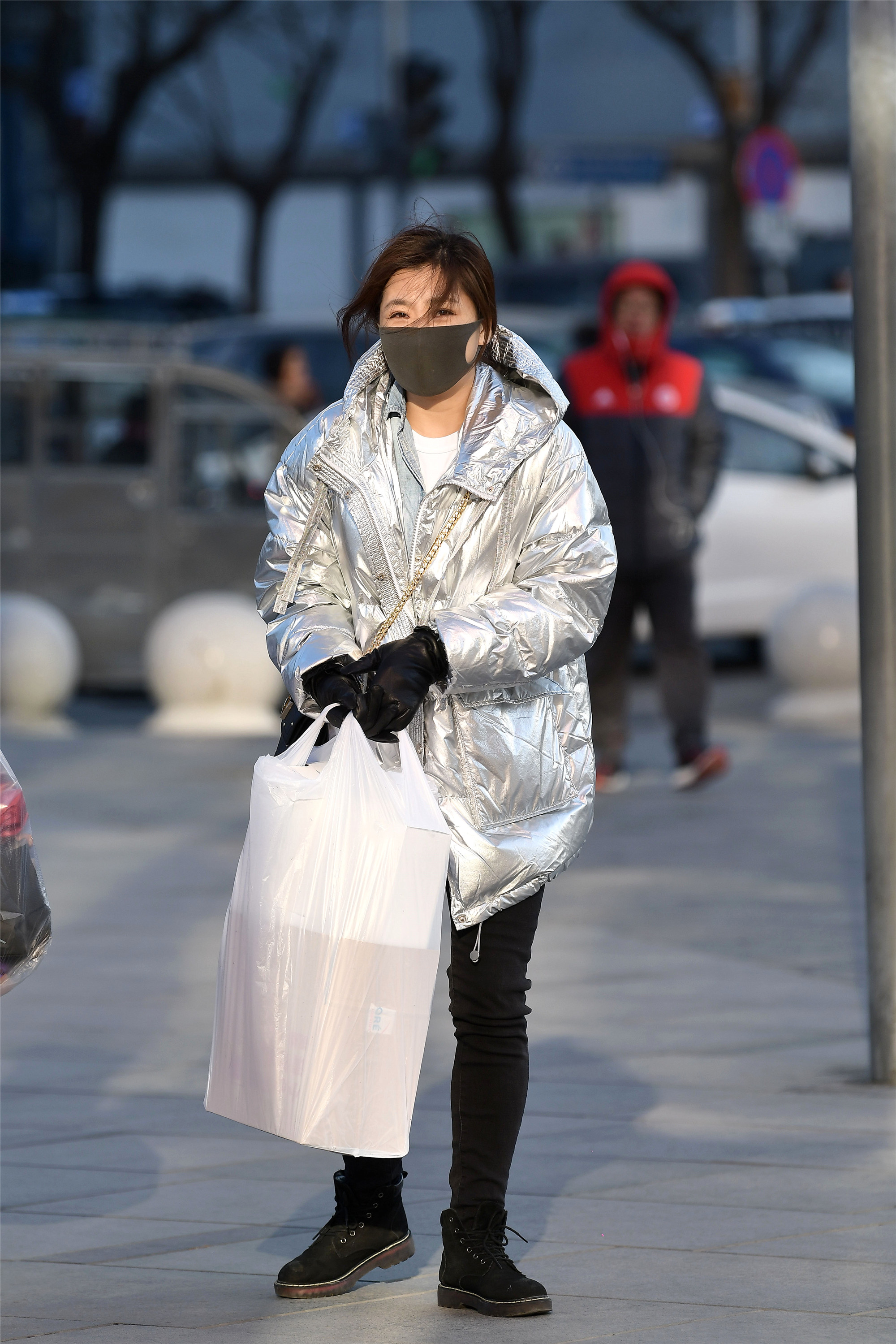 这款银色羽绒服,不是特别的亮,似乎特地压低了色调,看起来会显得低调一些,宽松的款式却用了不对称的设计,而姑娘有没有把拉链拉起来,这样看着会更有层次感,与她的闺蜜穿的皮夹克恰好形成了两种风格。
