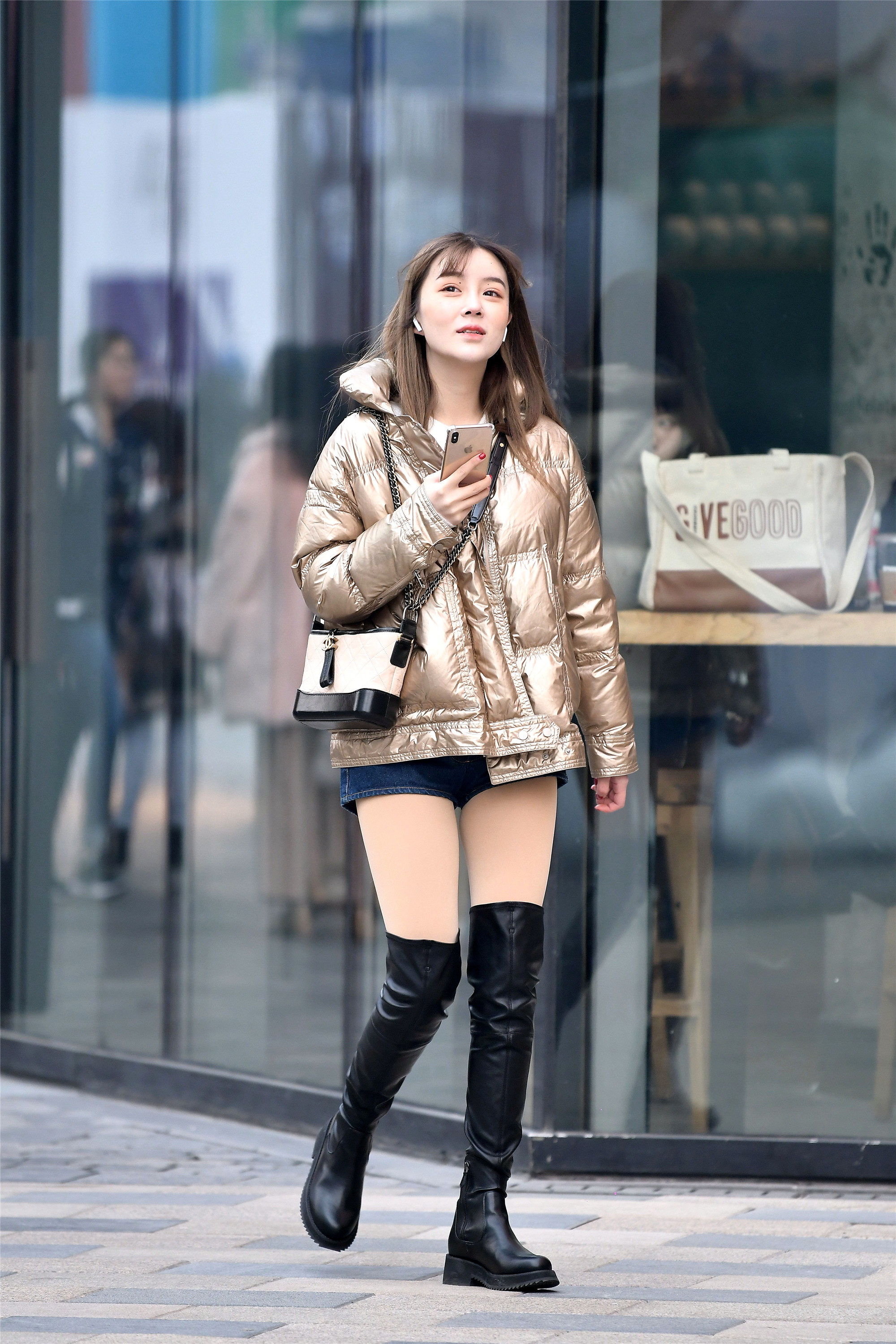 暗金色短款羽绒服,色彩低调华贵,是一款很不错的羽绒服,与黑色很好搭配,在黑色皮靴的衬托下,更显身材高挑,穿着修身的肉色棉裤,搭配一条你牛仔短裤,在初冬季节搭配的也很有层次。